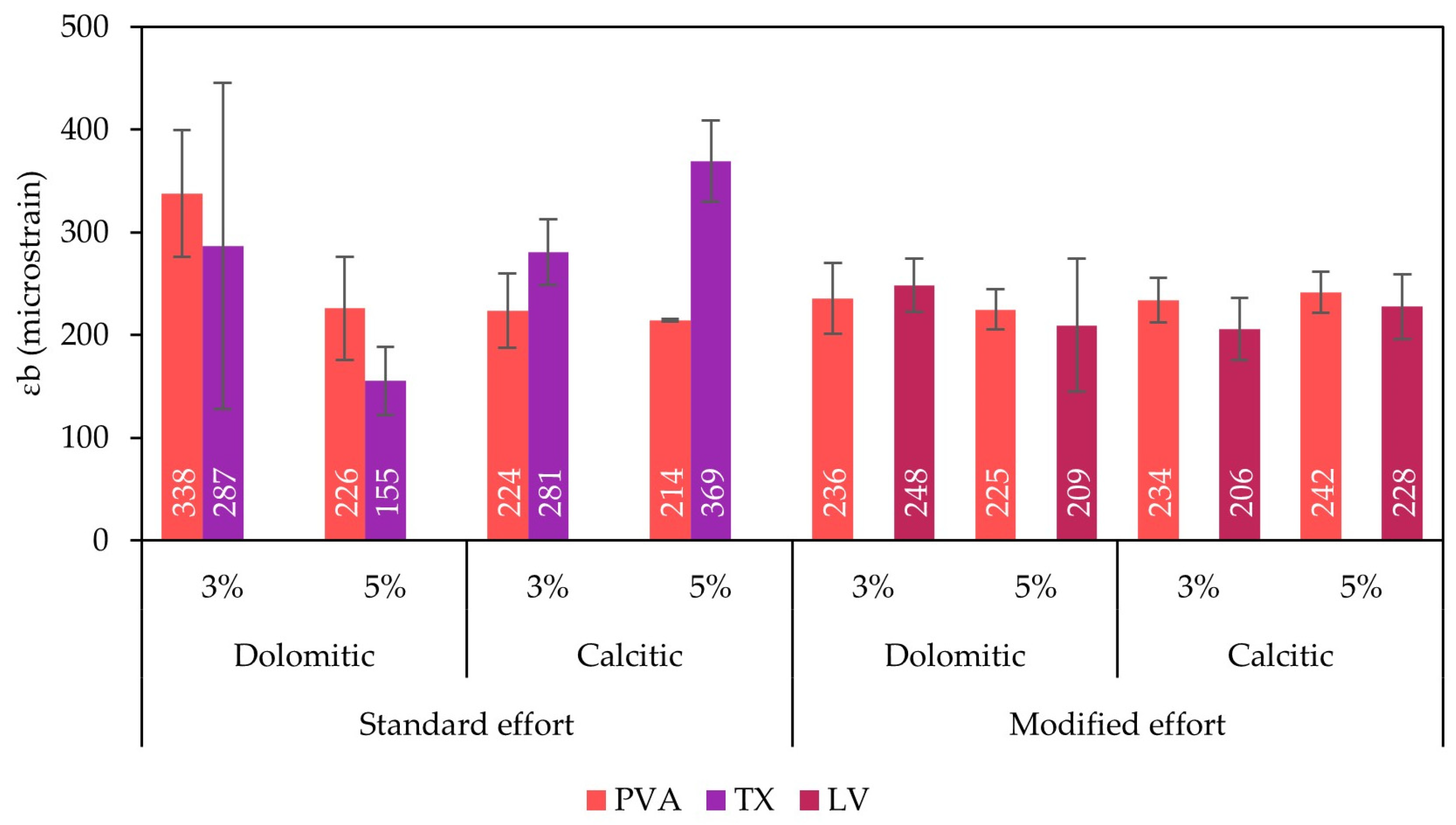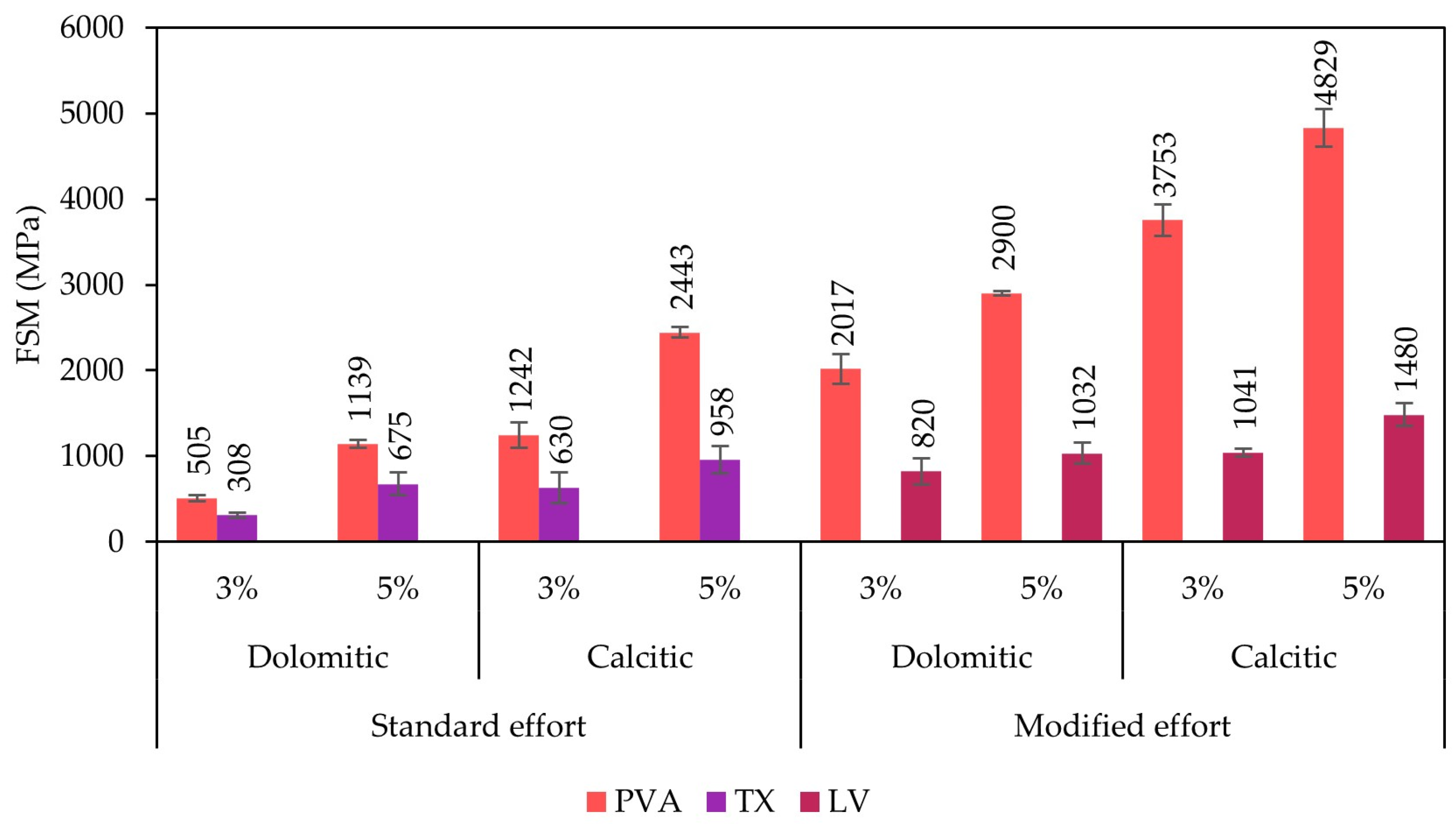 - All three soils responded positively to lime treatment, though to different extents. Argisol (PVA) and Latosol (LV), particularly when compacted with modified effort, achieved high strength and stiffness and demonstrated performance consistent with lime-stabilized materials. In contrast, Luvisol (TX) showed more moderate improvements, consistent with soil modification. These trends are likely associated with its elevated organic matter content (1.5%) and high potassium concentration (>400 mg/dm3), both of which may inhibit pozzolanic reactions. These findings emphasize that lime treatment performance is soil-dependent, and that stabilization feasibility must be evaluated for each soil according to its reactivity with lime.