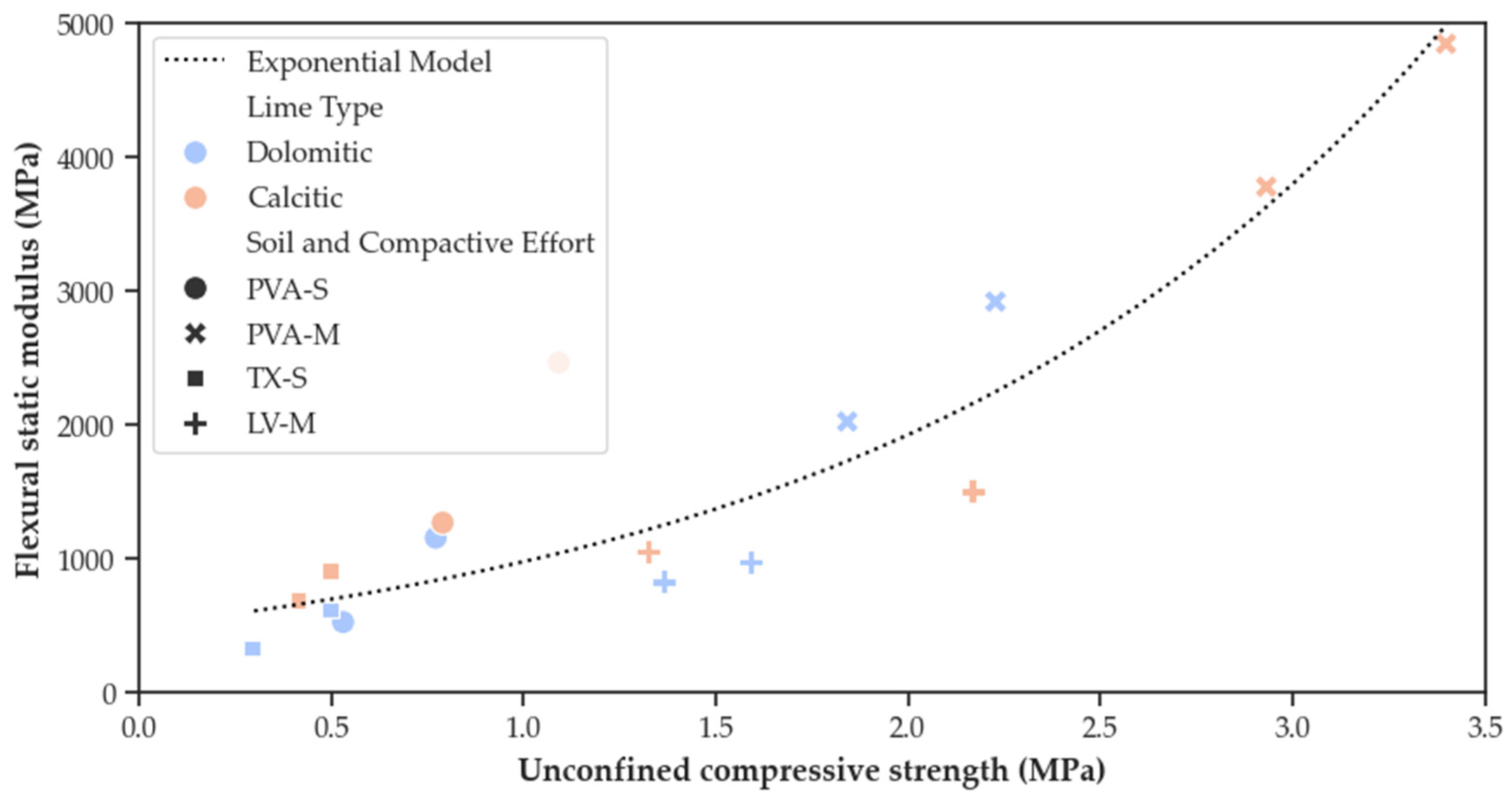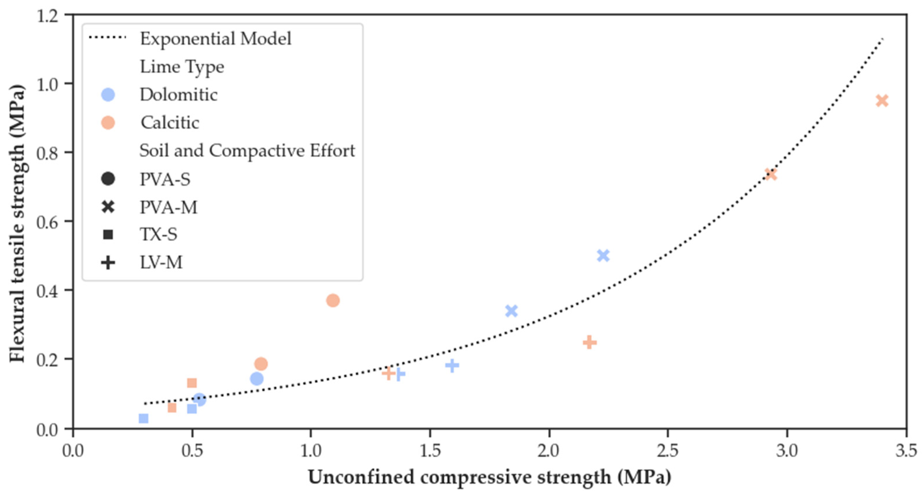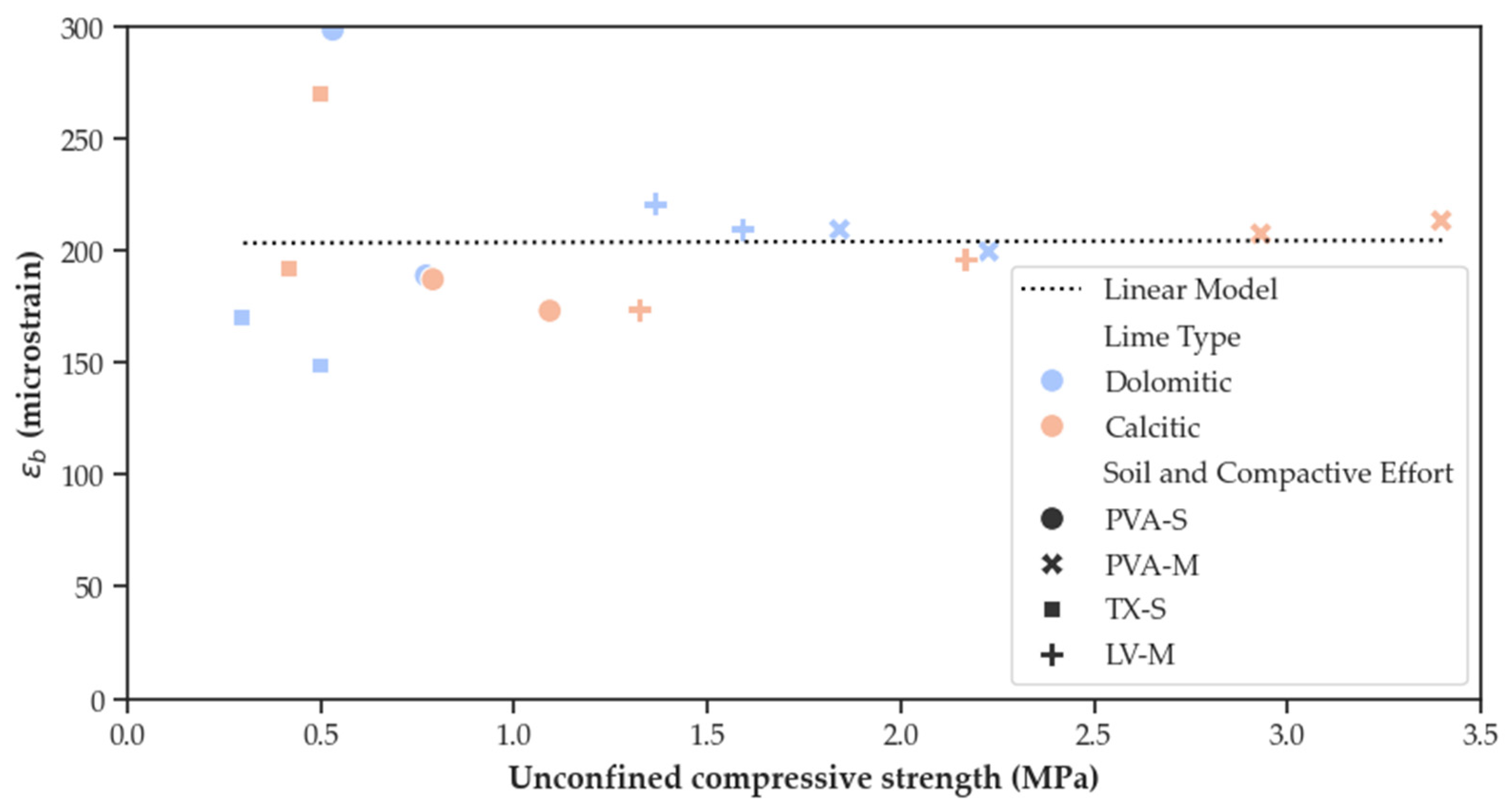 - Baldovino, J.A.; Moreira, E.B.; Izzo, R.L.S.; Rose, J.L. Empirical Relationships with Unconfined Compressive Strength and Split Tensile Strength for the Long Term of a Lime-Treated Silty Soil. J. Mater. Civ. Eng. 2018, 30, 06018008. [Google Scholar] [CrossRef]