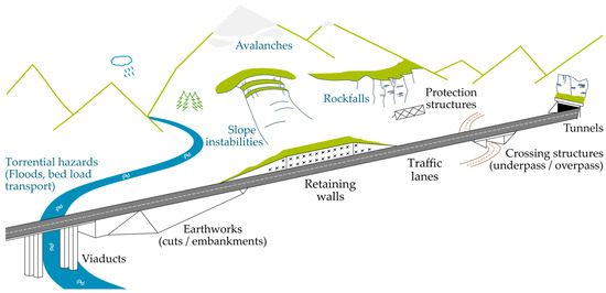 This infrastructure is also exposed to various hazards, especially hydrological and gravity-driven (HG) natural hazards specific to mountainous areas: torrential hazards (floods, bed load transport, and debris flows), and various types of slope instabilities, rockfalls, and snow avalanches. Figure 1 summarises the various structures and hazards frequently found on this type of infrastructure.