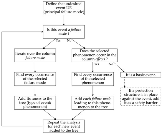 Several authors have studied the links between FTA and FMEA [40,41]. The combined use of the two methods varies from simple cross-checking of the results to advanced analysis frameworks, alternating between the two methods depending on the needs of specific contexts. In this study, FMEA is used to develop a fault tree in a systematic manner, limiting the use of expertise that could introduce bias. Failure modes are identified using FMEA, and the fault tree refocuses the analysis on a single undesired event, retaining only the events that can lead to it and modelling cascading failure scenarios. In constructing the tree, two types of events are distinguished [38]: failure modes, as in FMEA, and phenomena, which are the causes and effects. When a phenomenon is both the effect of one failure mode and the cause of another, it forms a link between two cascading failure modes. In this way, all scenarios can be constructed.