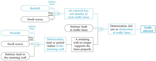 In current practices, structural faults and identified natural hazards are regularly monitored (inspections, instrumentation, diagnostics, etc.). The failure scenario model links these events to the structural and functional consequences on the infrastructure. Functional logic and the use of FTA make it possible to represent the events leading to the undesired event, i.e., those that directly or indirectly affect traffic. Thus, the model allows for the analysis of risks: the potential, when exposed to hazards, for negative consequences on the infrastructure’s level of service.