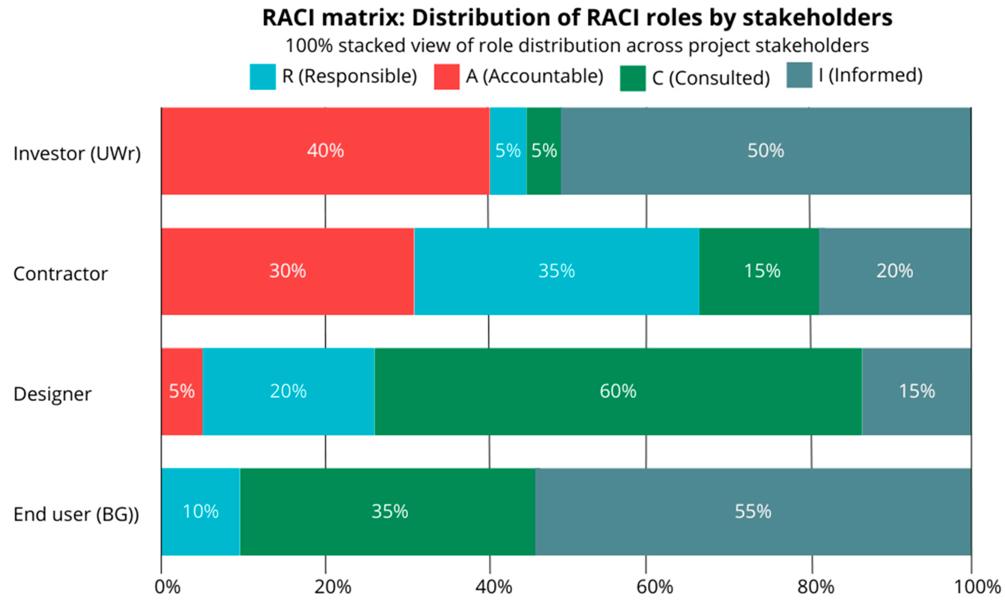 The assignment profile for the designer is characterized by a predominance of Consulted (C) roles while maintaining a significant share of Responsible (R) roles for the preparation of documentation and BIM models. This configuration indicates that the designer performs the function of a specialized technical advisor, whose expert knowledge is used both at the stage of formulating design solutions and in assessing their consequences within multi-criteria analyses (AHP–BOCR). The limited number of Accountable (A) roles on the designer’s side confirms that the ultimate responsibility for decisions lies with the investor and the contractor, while the designer co-shapes these decisions by providing structured technical information.