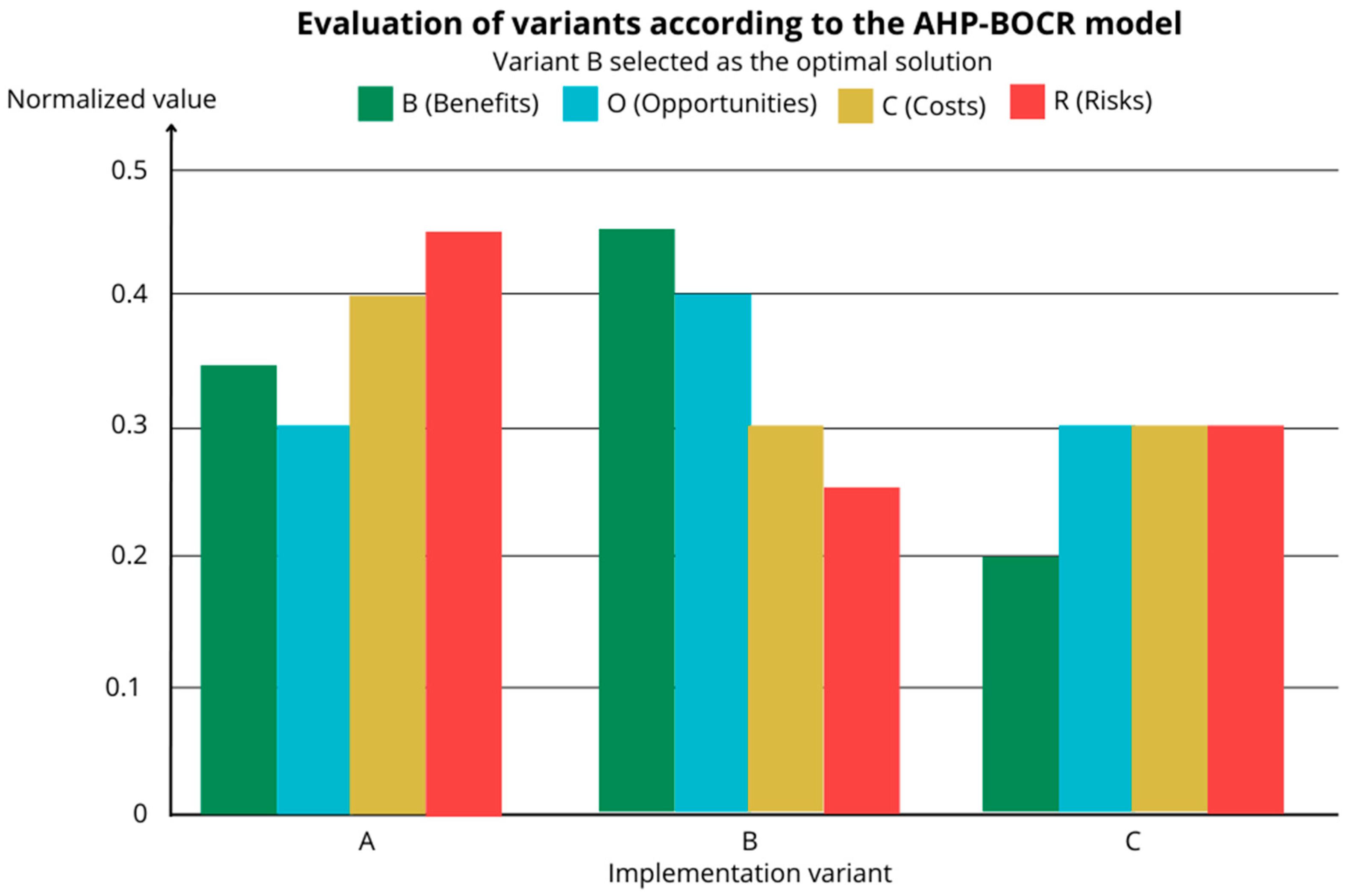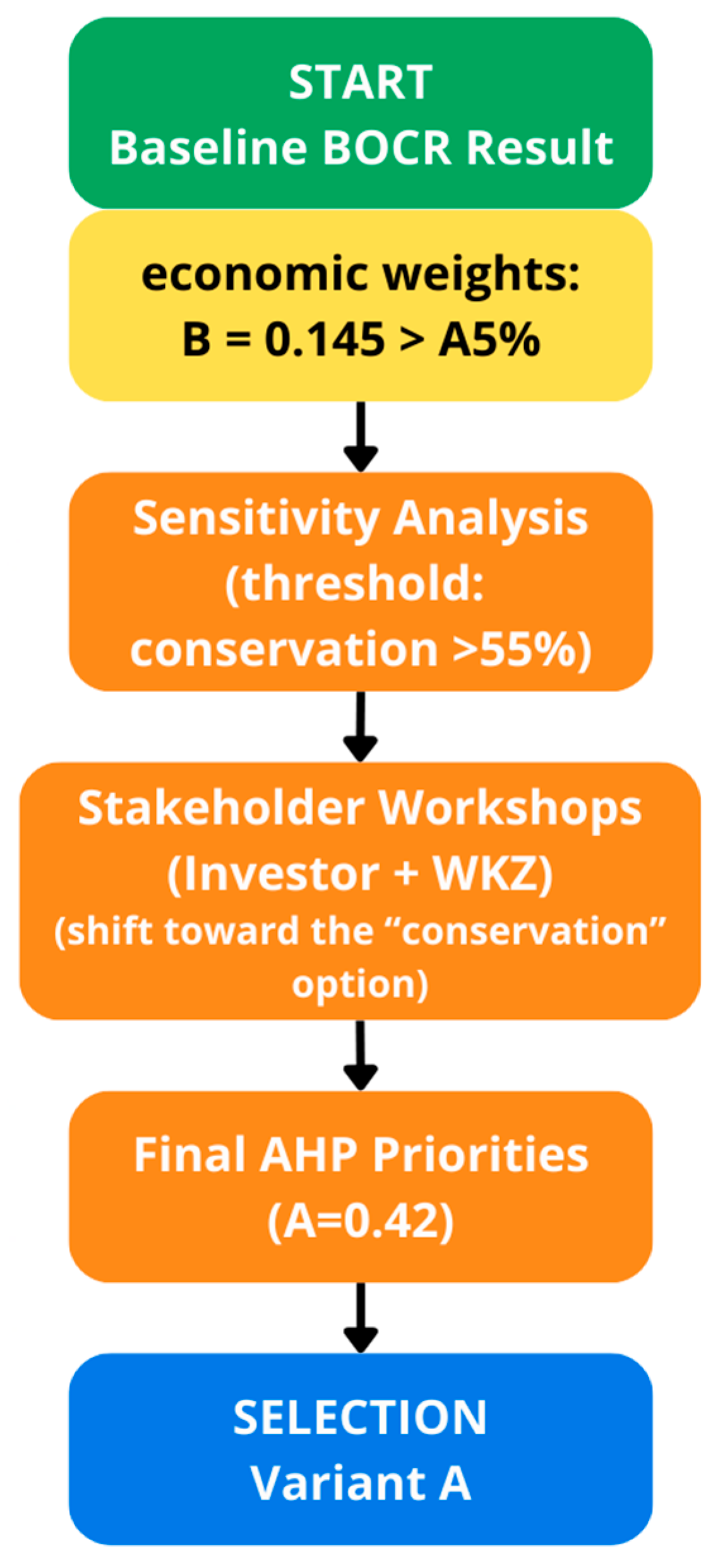 Figure 7, the decision path was iterative, starting from the baseline BOCR result (preference for Variant B under economically oriented weights), followed by sensitivity analysis, stakeholder workshops, and finally leading to the adjusted AHP priorities presented in