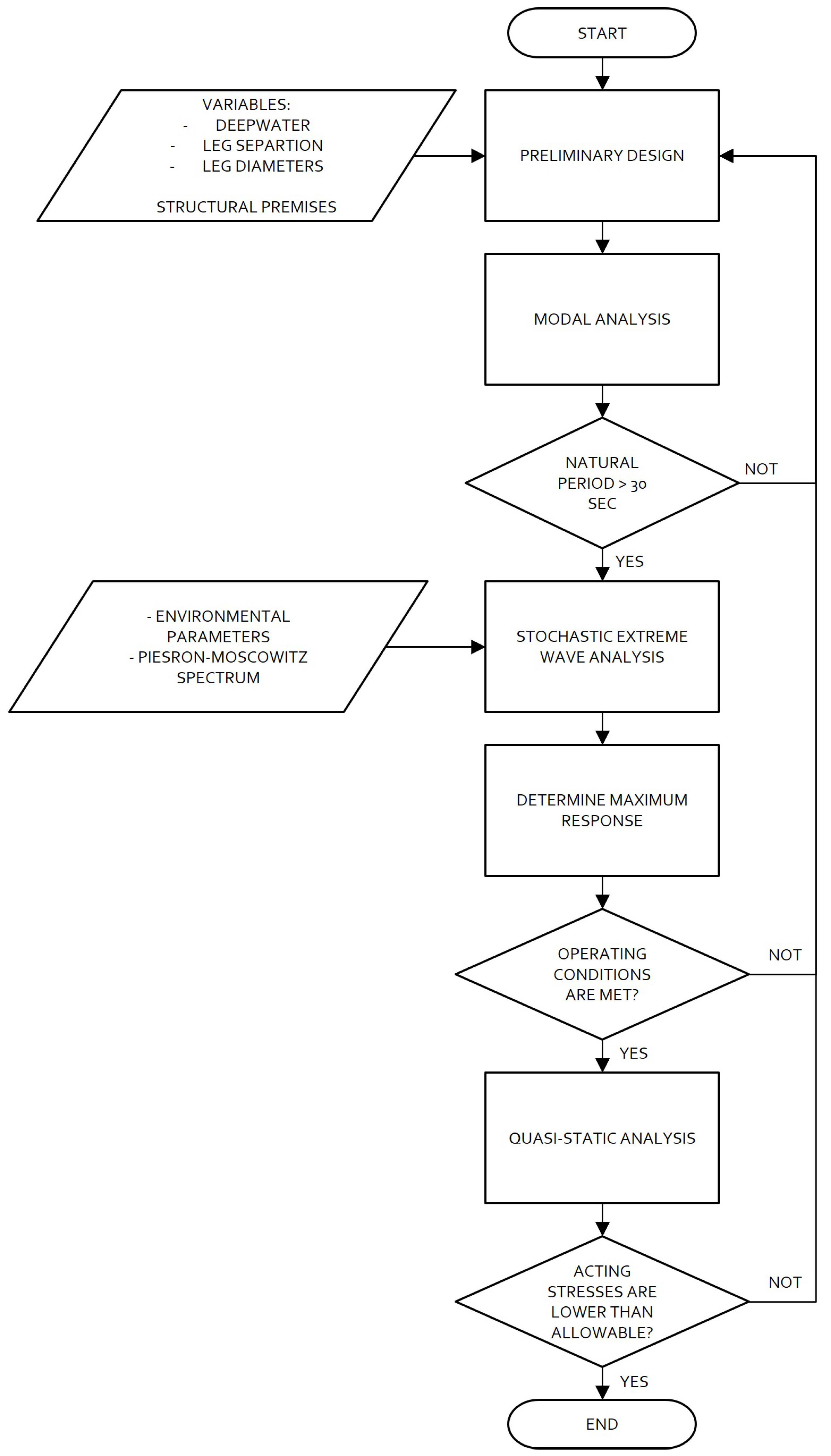 13]. If this requirement was not met, the studied variables (buoyancy, leg separation and leg diameter) were modified until obtaining an adequate structural behavior (i.e.,