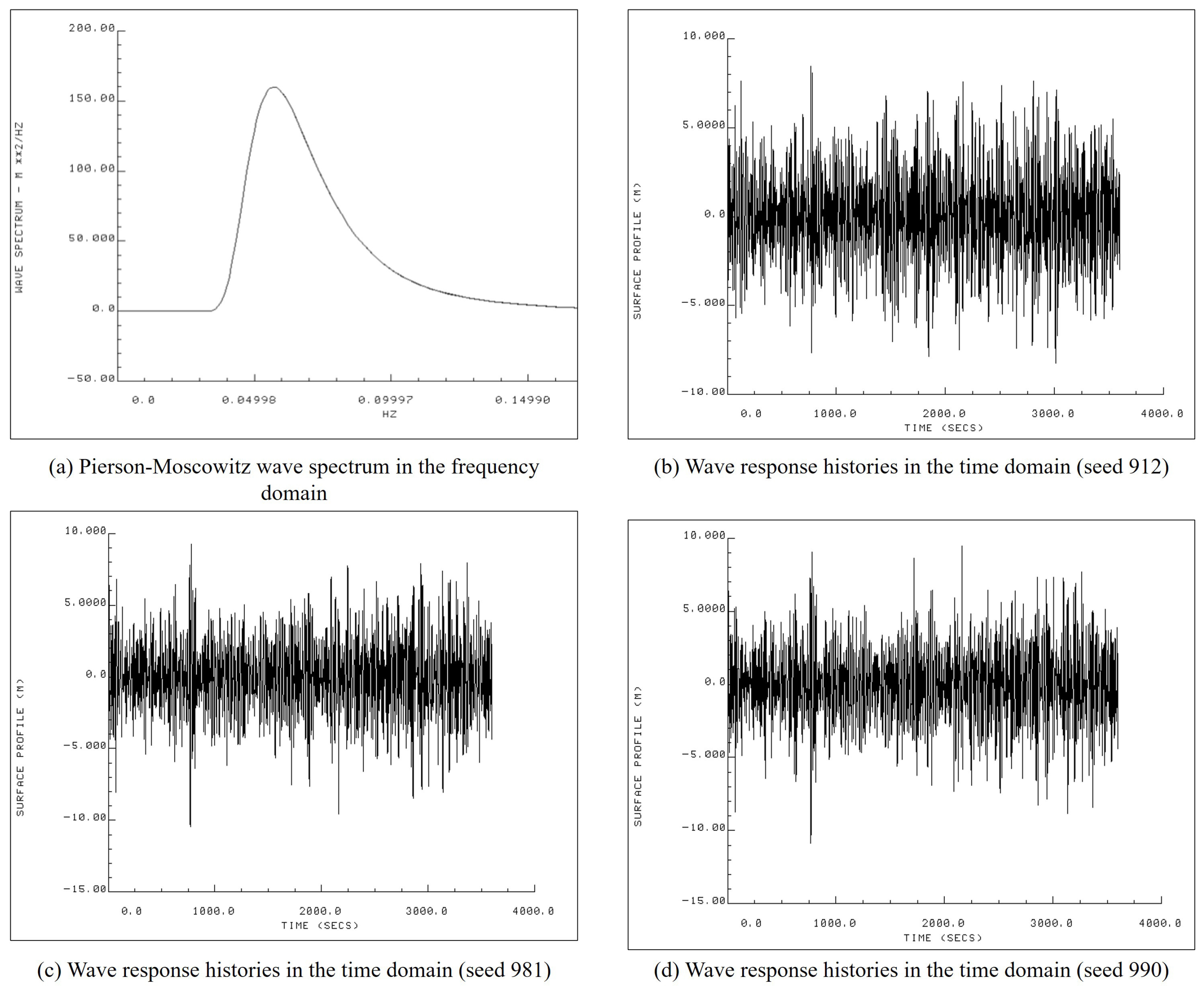 The wave height histories were calculated in the time domain using the Pierson–Moscowitz wave spectral density [