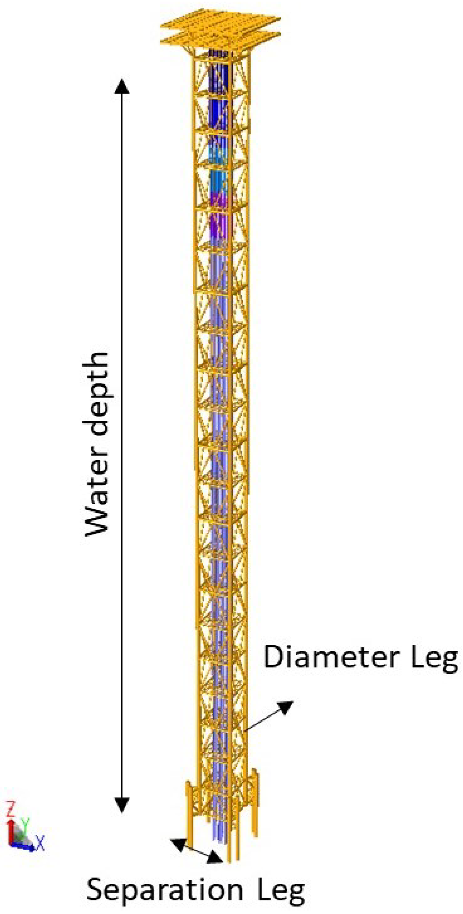 Figure 5 shows a three-dimensional structural configuration of the compliant tower indicating its main parts; meanwhile,