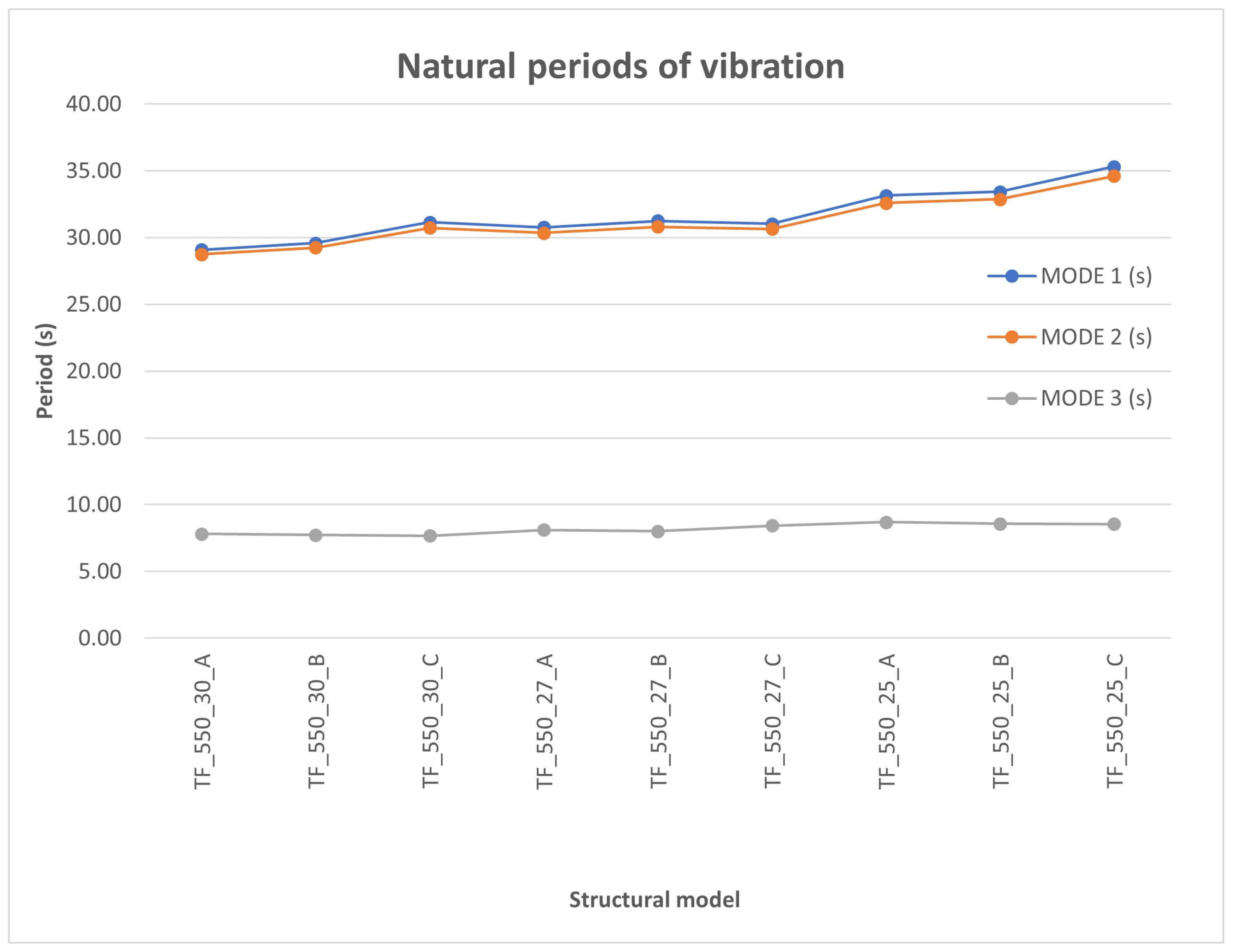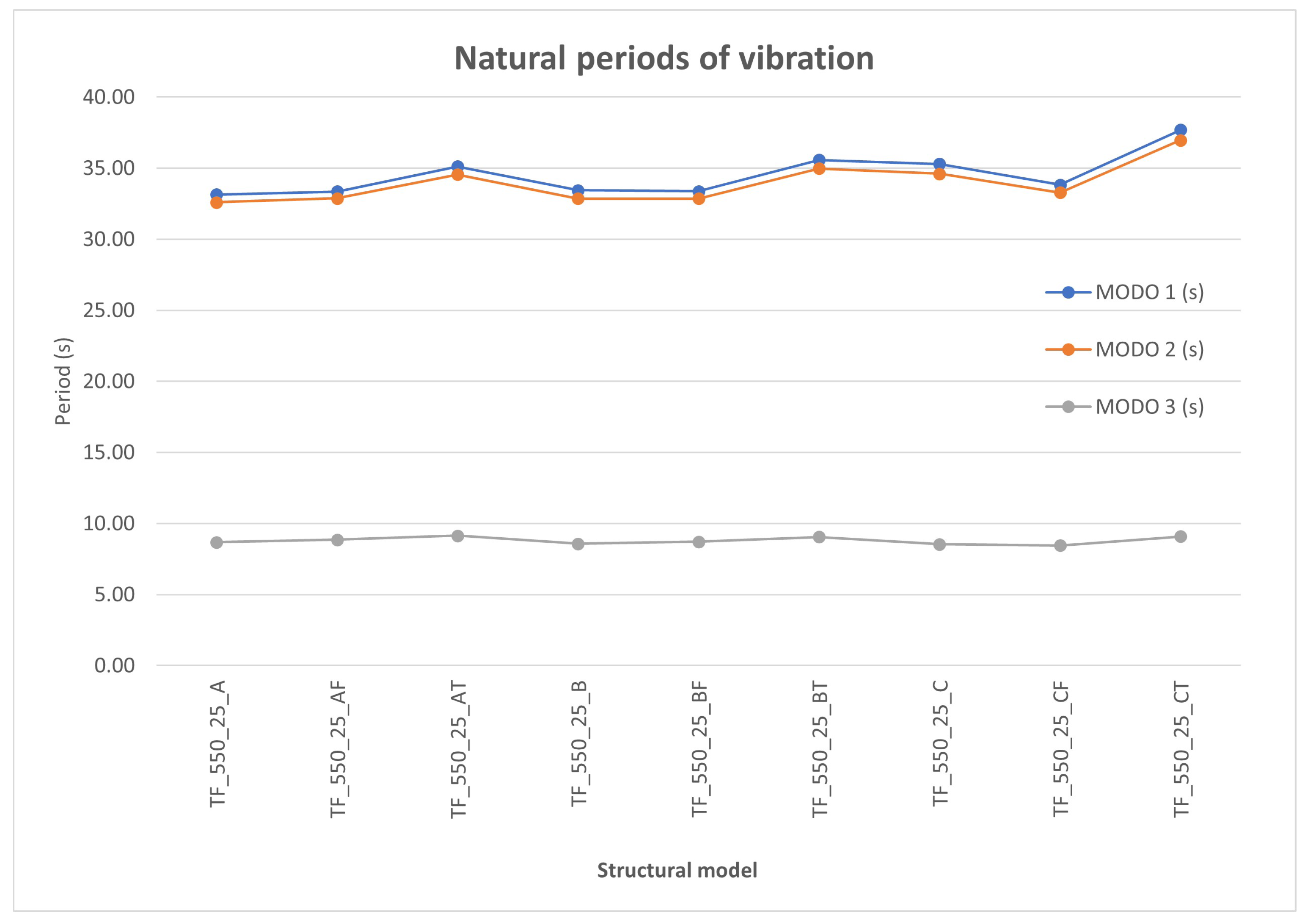 Figure 14 shows the first three natural vibrating periods for the structural models described in