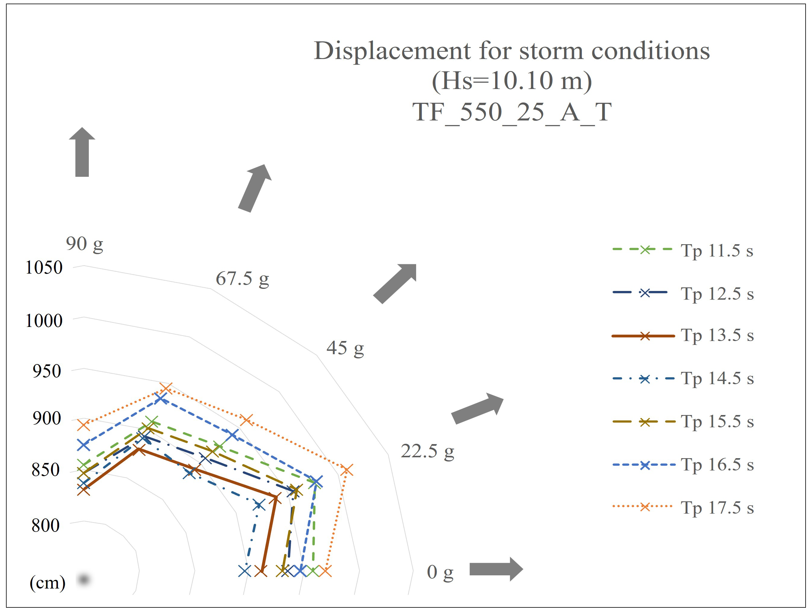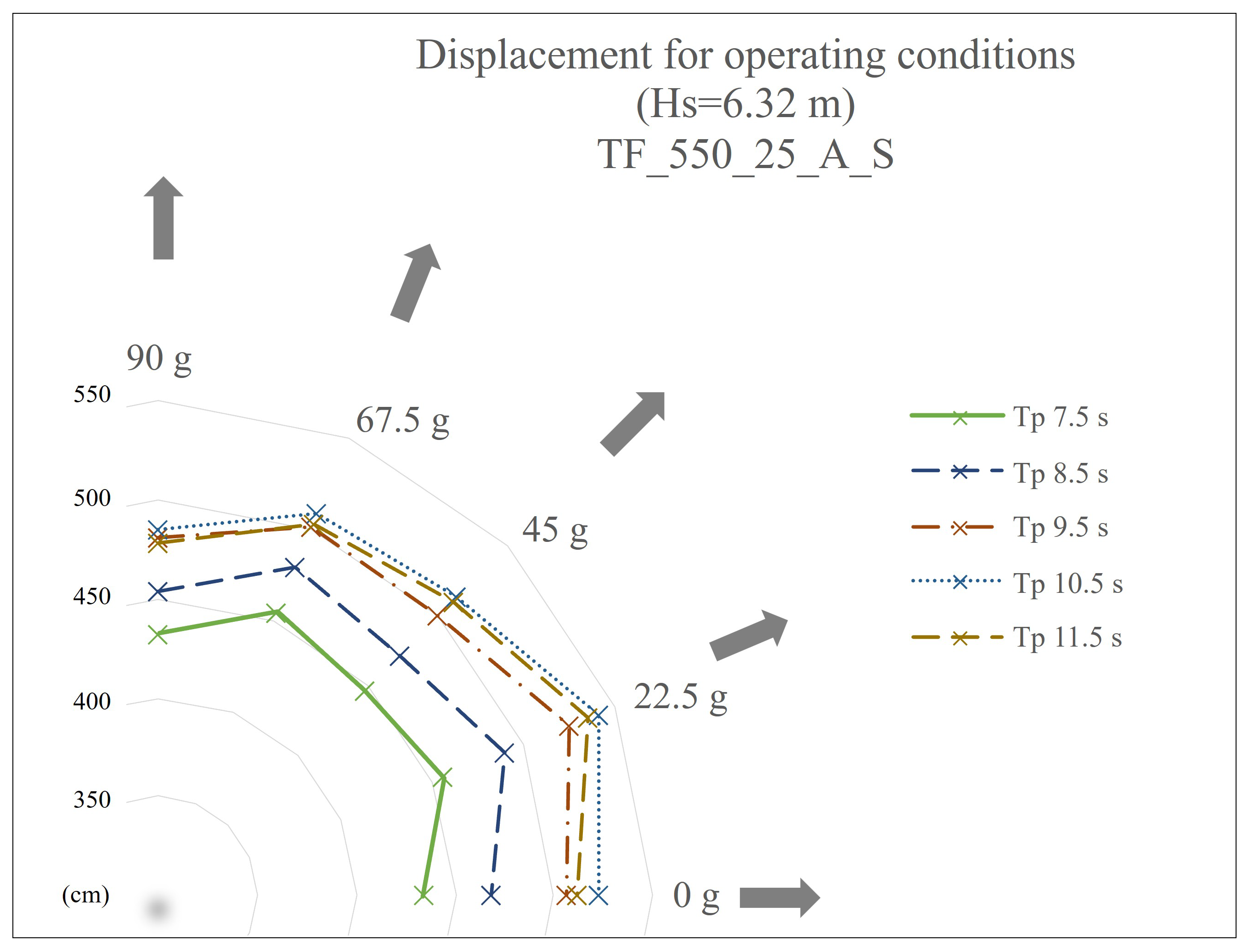 Figure 10 displacements under operating condition are shorter than displacements under storm condition. Based on these displacements and the structural response, it was determined that the greater the peak period, the greater the displacement.