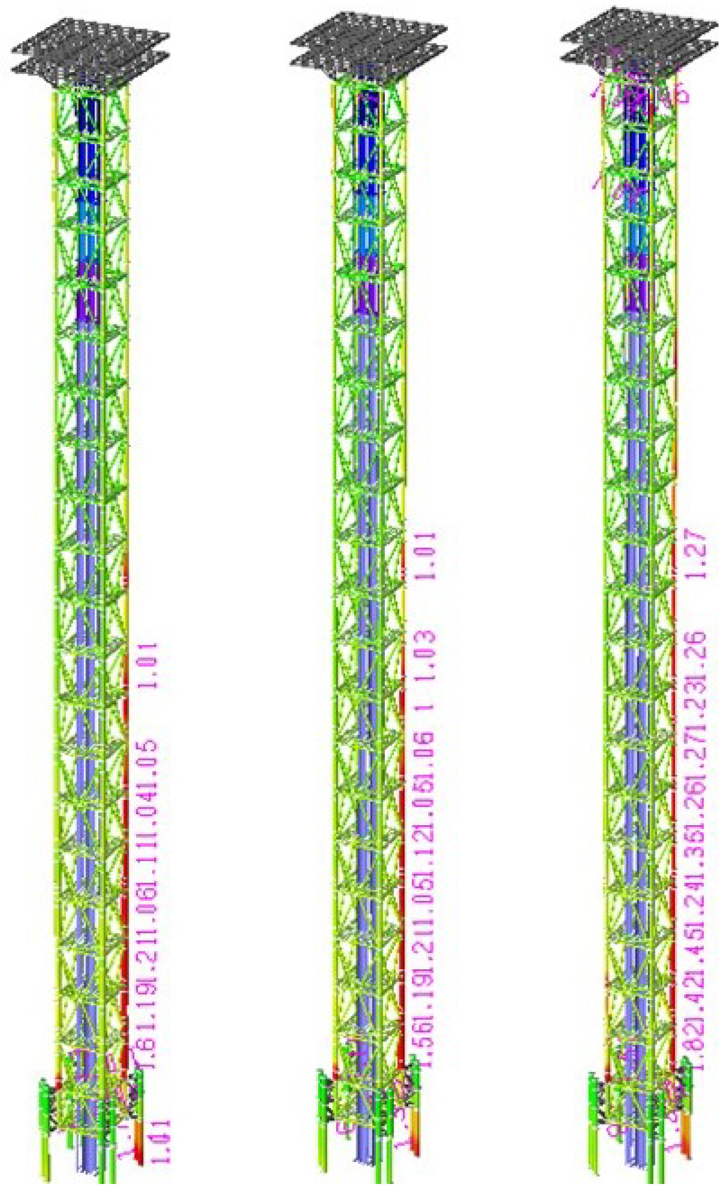 Additionally, it is observed that leg transitions from the foundation module to the tower module present interaction ratios equal or greater than 1.00 (unsafe condition). In this zone, the acting stresses due to axial forces and bending moments are higher, because of the change of stiffness between both modules.