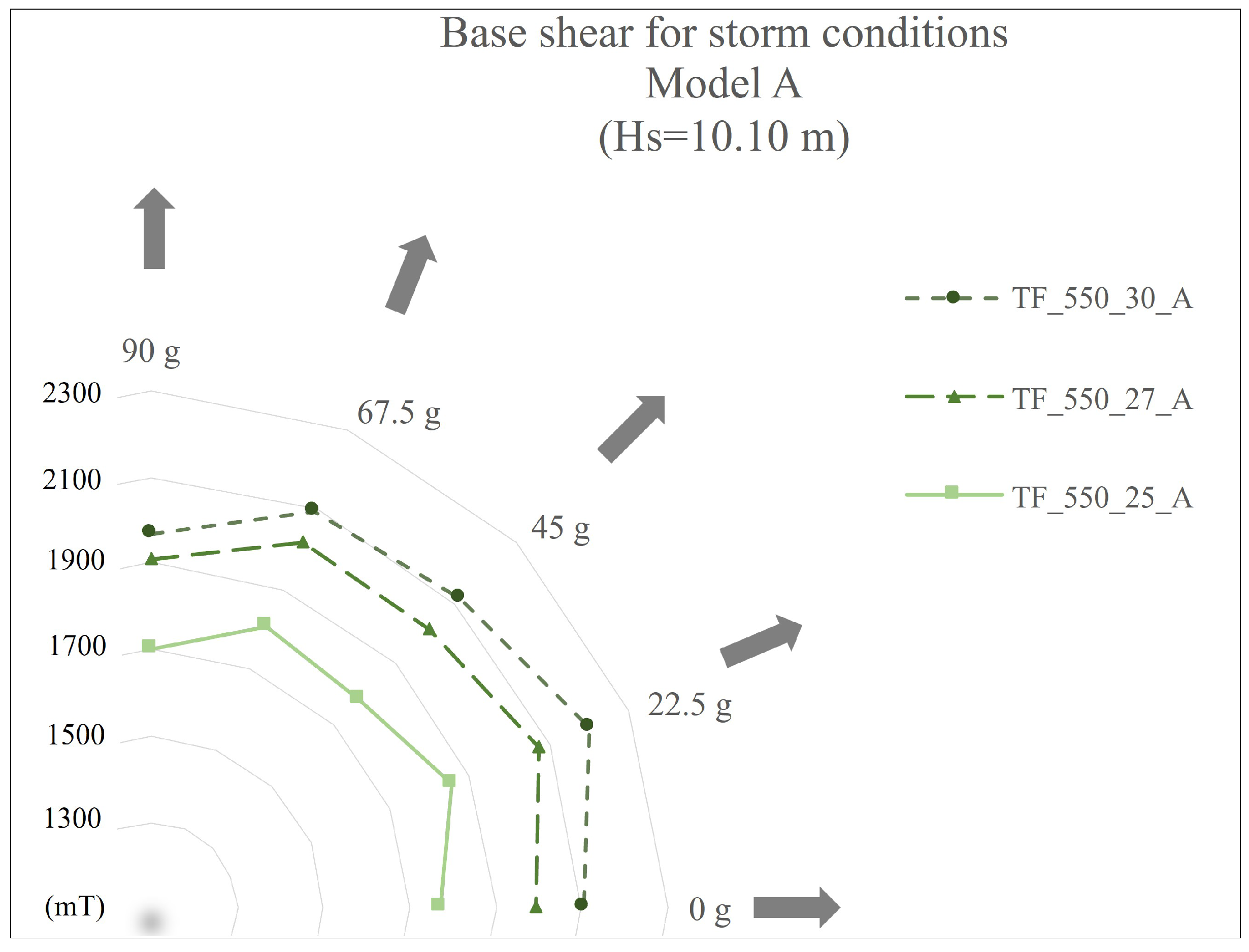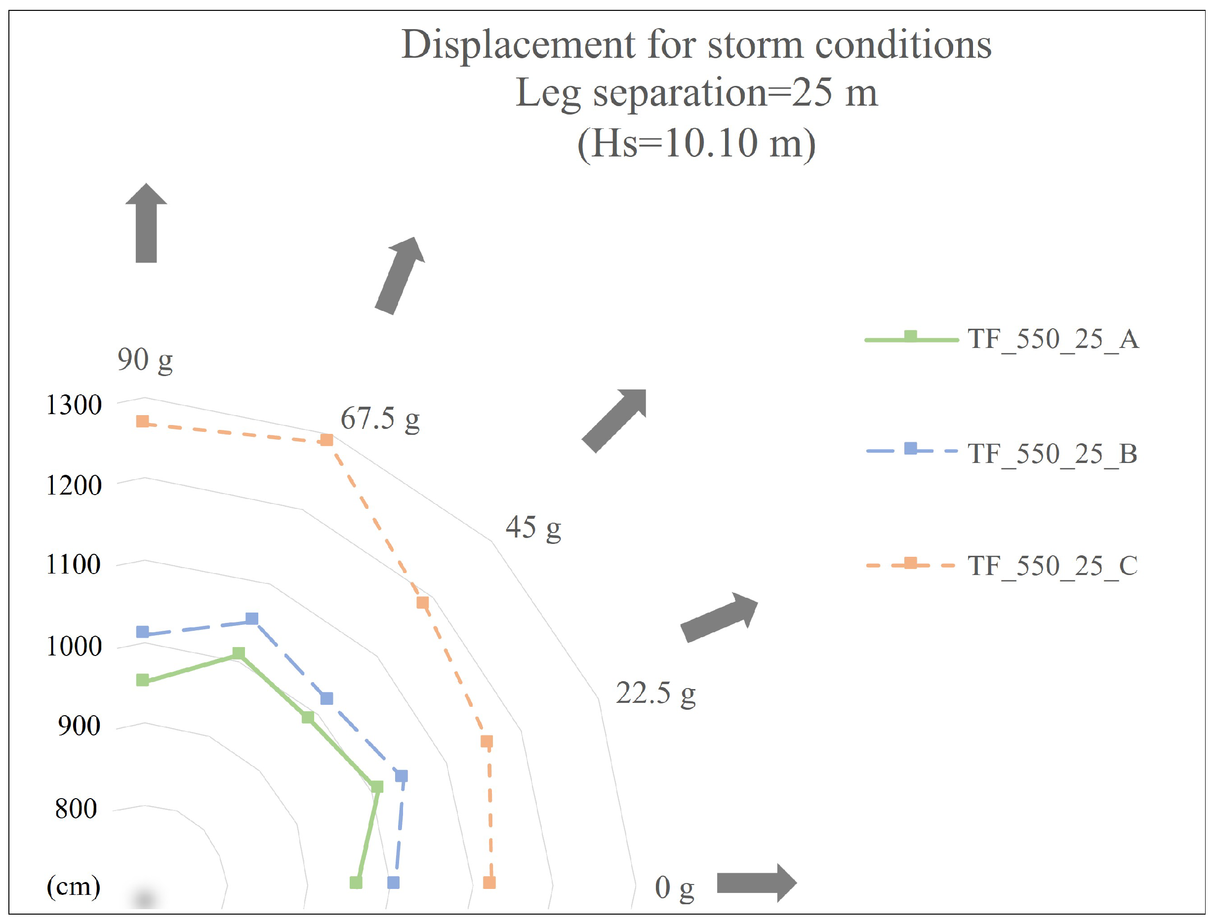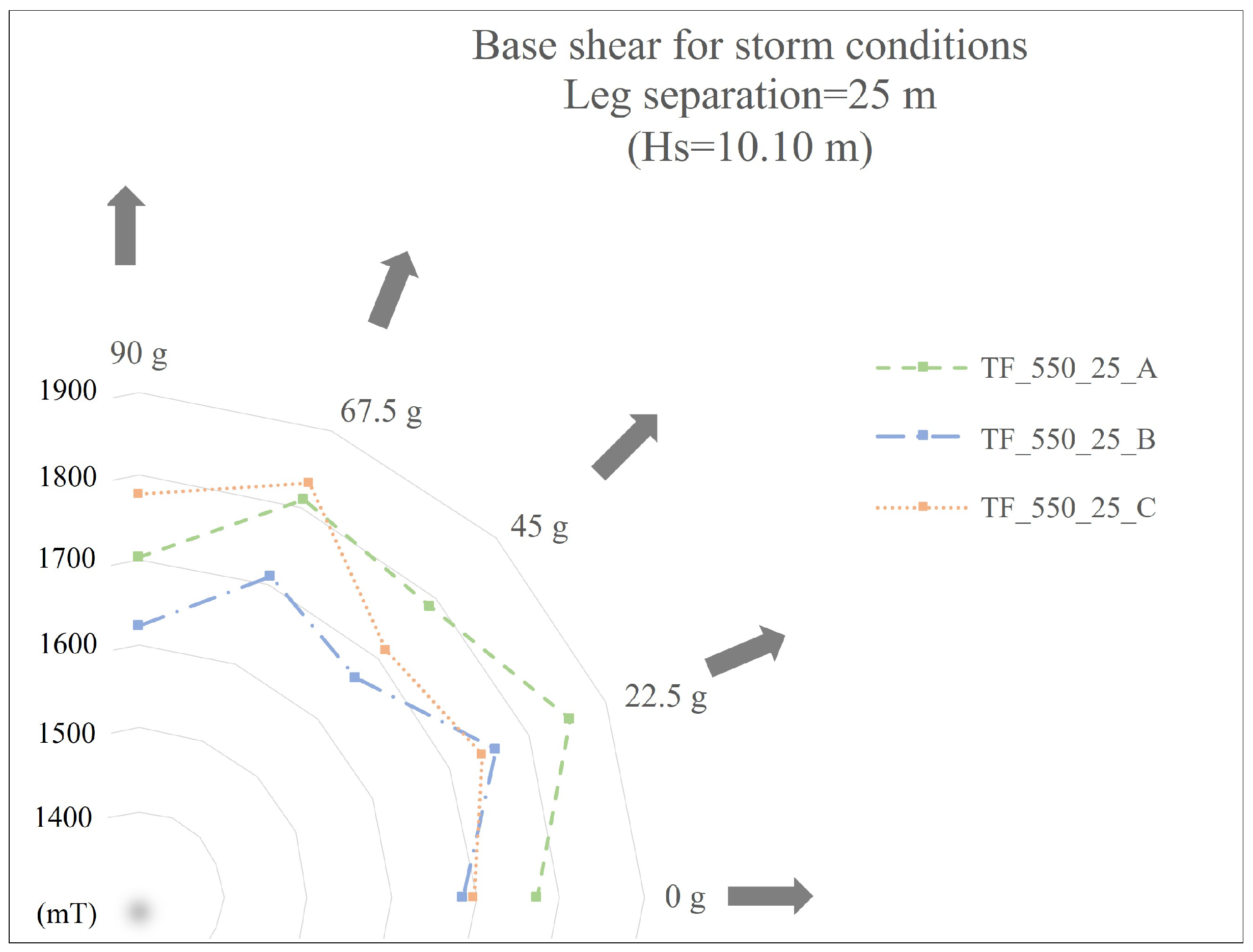 A parametric study was performed considering the subsequent cases of leg separation: 25 m, 27.5 m, and 30 m, as well as leg diameters A, B, and C (as previously described in the