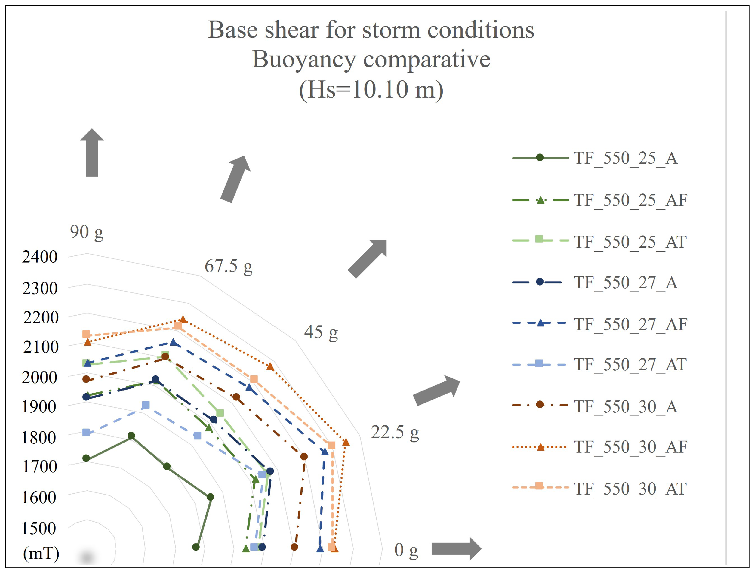 After evaluating the considered variables, the best proposal was the numerical model with 25 m leg separation, leg diameters from 3300 mm (130 in) to 2135 mm (84 in), and buoyancy tanks located at 90 m water depth (TF-550-25-AT1). In this numerical model, base shears were reduced but the structural response produced interaction ratios higher than the one registered for the ultimate limit state (using ASD philosophy), see