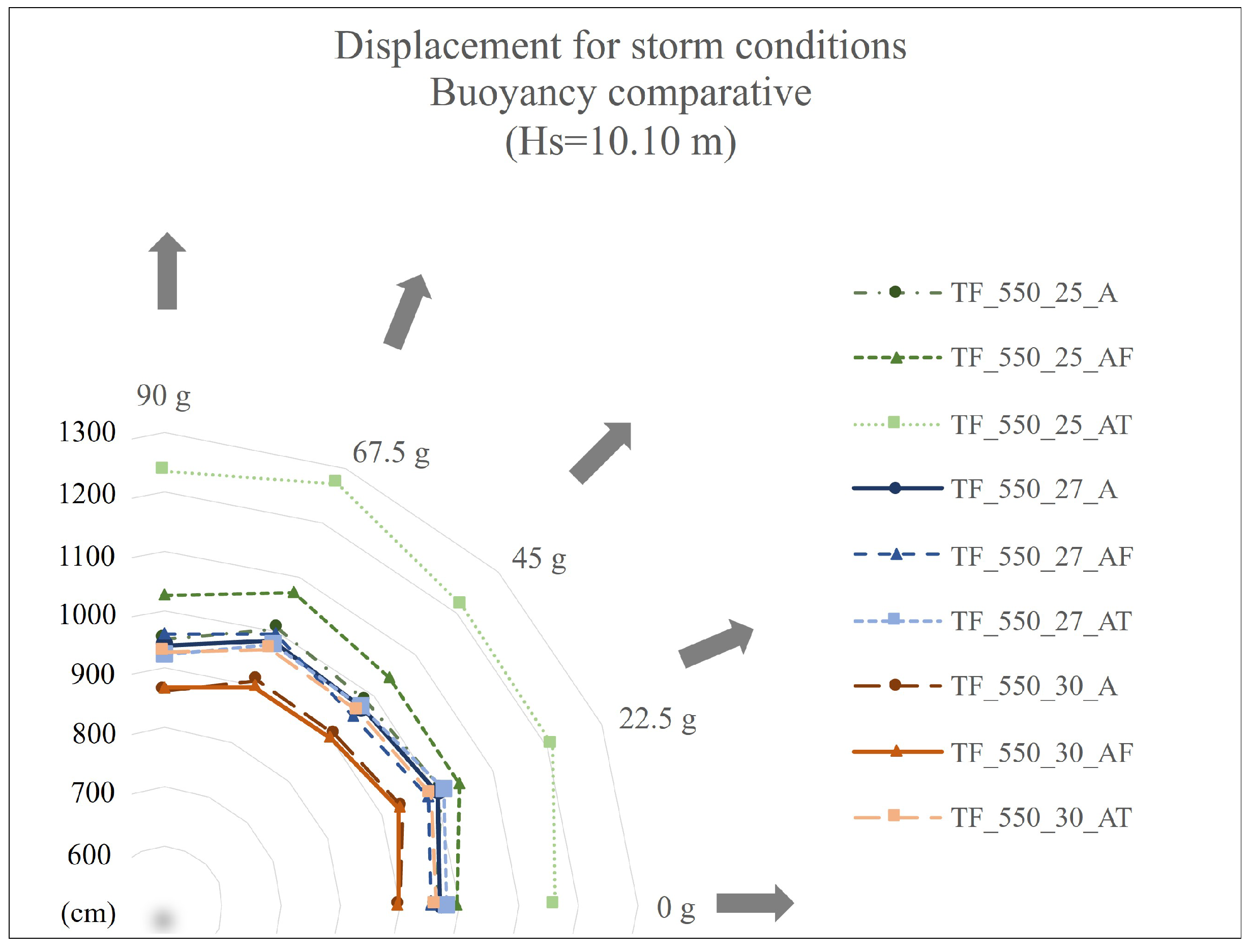 As for the displacements due to different peak periods, all of them were within the admissible range. Therefore, subsequent analyses considered only a 17.5 s peak period. In this way, computational time was reduced without compromising the accuracy of the results. Using model TF-550-25-AT1 as baseline, other variables capable to reduce the structural response were evaluated.