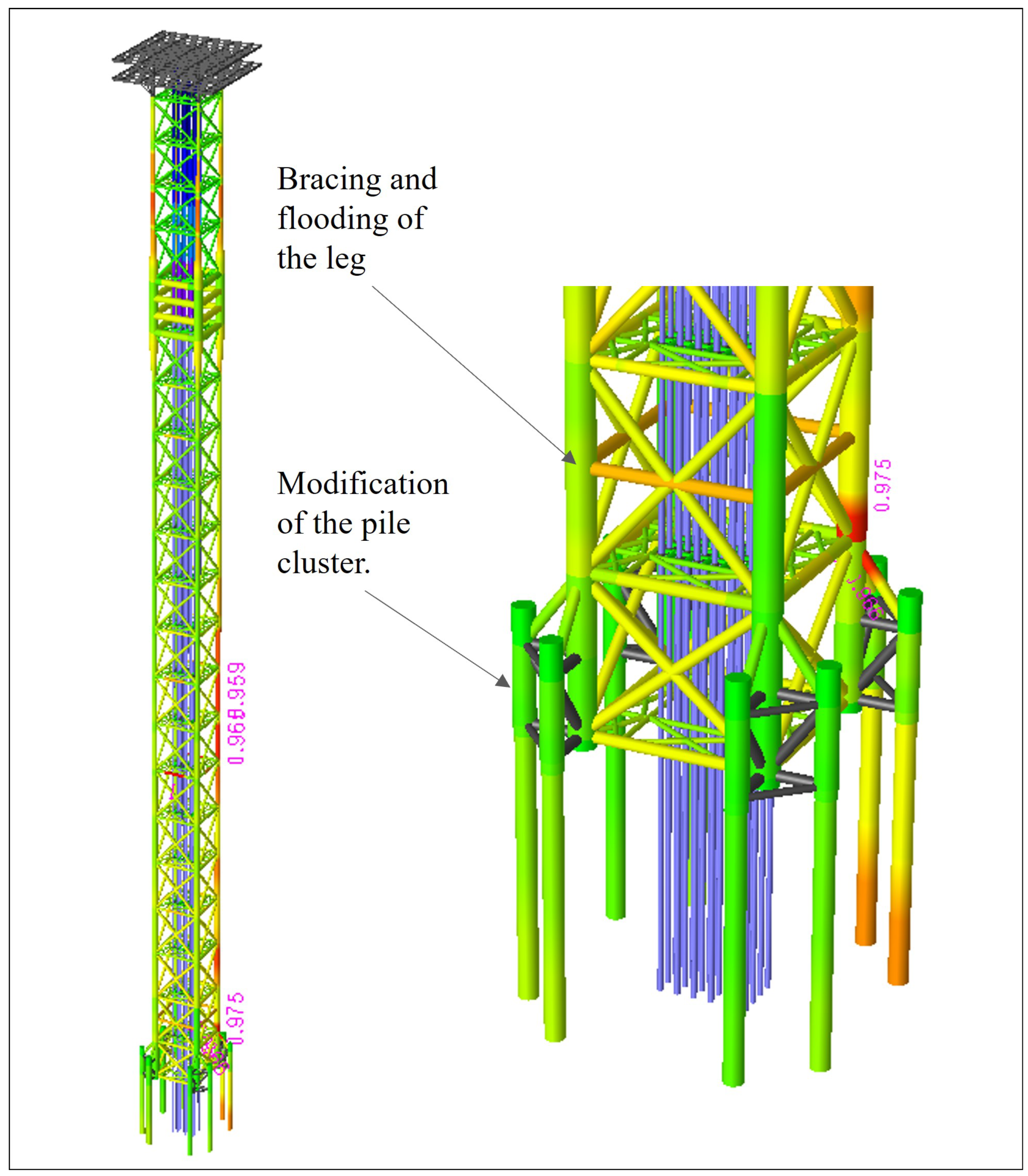 were located in the leg of the foundation module and in the middle of the tower. The increased