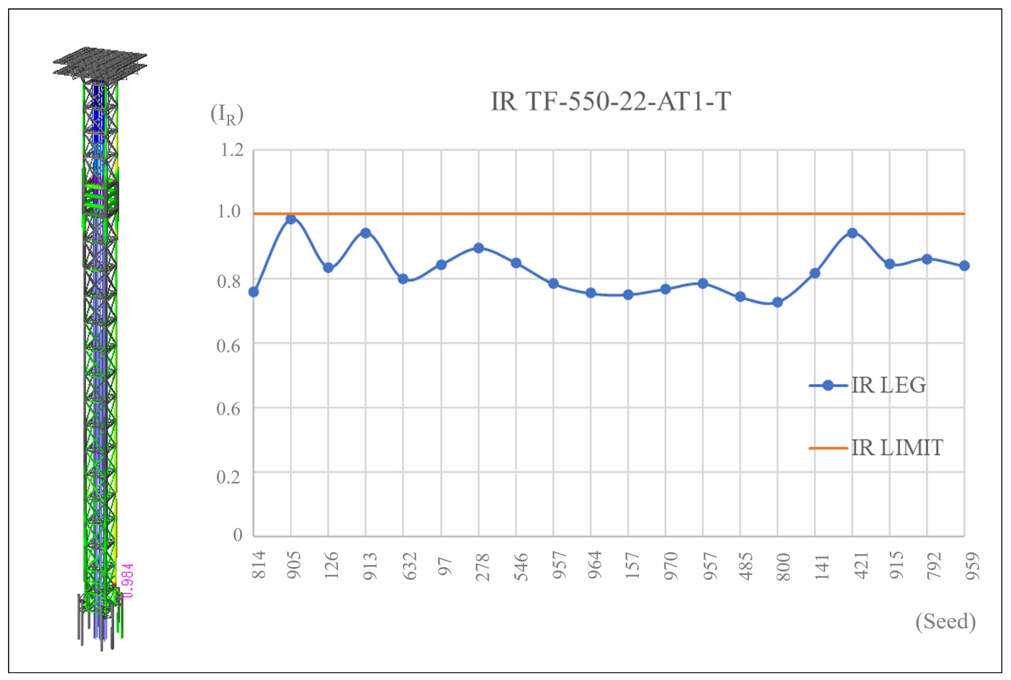 The revision of the acting stresses for model TF-550-25-AT5-T, however, is for one wave response history. Thus, model TF-550-25-AT5-T was re-examined with the leg separation reduced to 22.5 m. Additionally, the elements that presented an increased