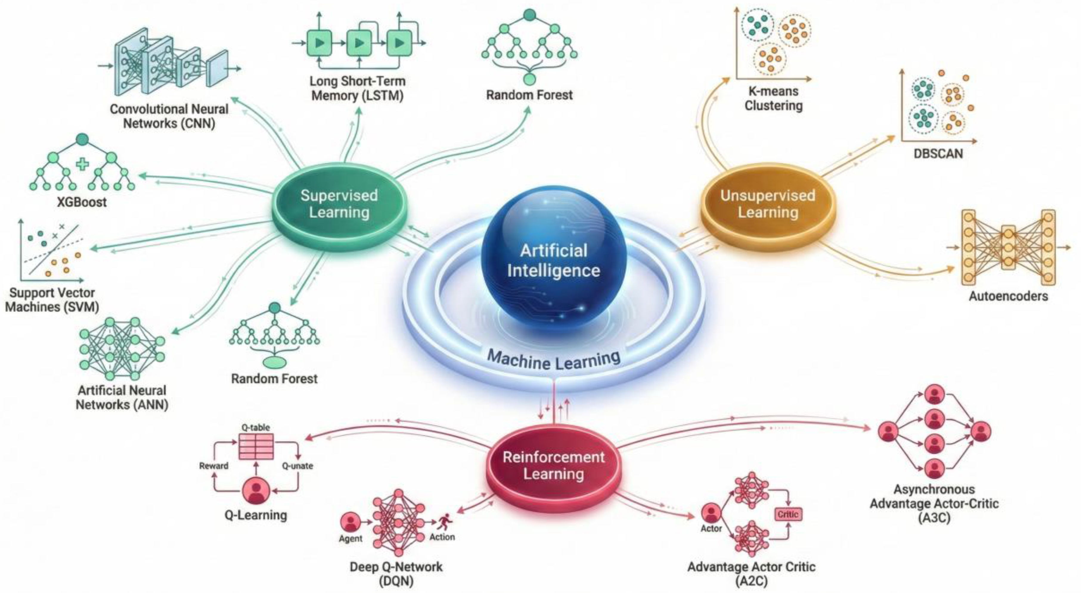- Three major ML paradigms were identified and categorized to address specific maintenance challenges: Supervised Learning, Unsupervised Learning, and Reinforcement Learning. Supervised Learning is the most dominant paradigm, primarily utilizing tree-based algorithms like RF for tabular maintenance logs and Deep Learning architectures (e.g., CNNs) for unstructured visual data. Unsupervised Learning (e.g., Autoencoders, K-Means) is critical for anomaly detection in the absence of labeled failure data. Reinforcement Learning (e.g., DQN, A2C) is emerging as a key tool for optimizing sequential decision-making tasks such as maintenance scheduling and renewal planning. This classification underscores the specialized utility of each algorithm type within the maintenance hierarchy.