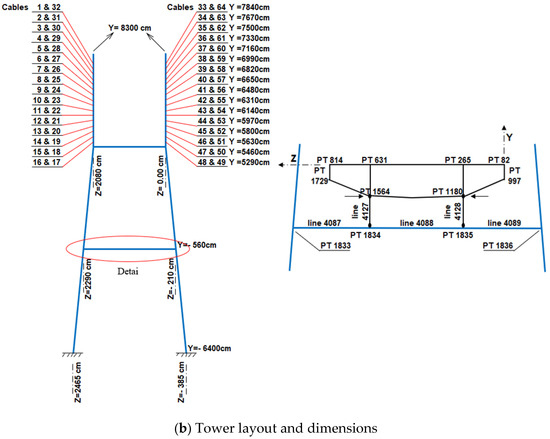 The stay cable system consists of 128 cables arranged in a double-plane, semi-fan configuration, with a spacing of approximately 10 to 12 m along the deck (see Figure 1b). The cables are grouped according to their positions, with cross-sectional areas ranging from 67.06 cm2 for the largest cables near mid-span to 27.51 cm2 for the smallest cables near the side spans. This arrangement optimizes force distribution while maintaining an efficient and aesthetically pleasing geometry.