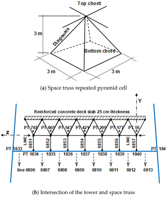 The proposed deck system consists of a composite space truss structure designed to replace the conventional steel box girder in cable-stayed bridge applications. The system is formed from a series of repeated square-on-square pyramid units, each with a 3 m × 3 m base and a height of 3 m, creating a highly efficient three-dimensional structural framework (see Figure 3a). This space truss acts compositely with a 25 cm hollow reinforced concrete slab, which serves as the riding surface and contributes significantly to the global stiffness of the deck (see Figure 3b). Full interaction between the concrete slab and the top chord members of the truss is assumed, ensuring effective composite action and minimizing differential slip under service loads.