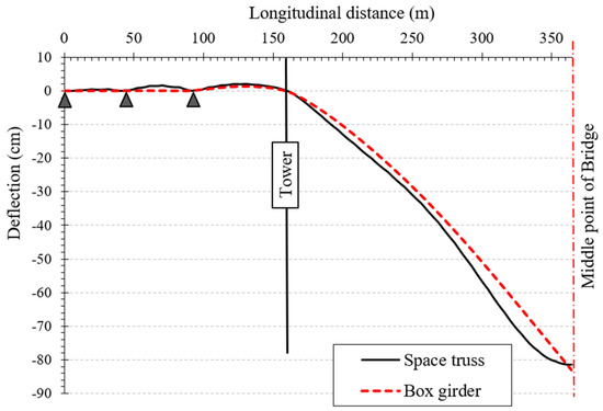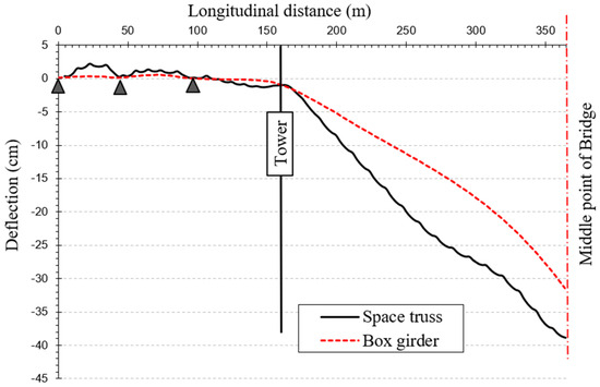 Deflection of the box girder versus composite space truss systems due to dead load.