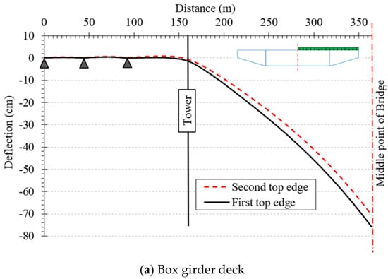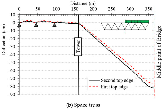 The torsional rigidity of the proposed bridge systems was evaluated under unsymmetrical loading conditions, where only half of the bridge width was subjected to live load. Figure 8 presents the vertical deflection profiles along the longitudinal direction of both bridge types, comparing the deflection of the two top edges. For the box girder deck, a noticeable difference in vertical displacement is observed between the loaded and unloaded edges, reaching approximately 5.26 cm at midspan. In contrast, the space truss system exhibits a smaller difference of about 4.93 cm between the two edges. This reduction in differential deflection demonstrates the higher torsional rigidity and improved resistance to twisting of the composite space truss system compared to the conventional box girder configuration.