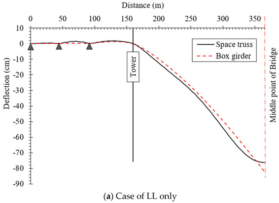Under the effect of live load (LL) only, both the space truss and box girder bridge systems display similar deformation trends along the bridge length, with minor deflections in the back span and significant sag in the main span beyond the tower (see Figure 10a). The space truss system exhibits slightly lower deflection values at midspan, approximately 75–80 cm downward, compared to 80–85 cm for the box girder, indicating marginally higher stiffness for the space truss under live loading alone. This behavior demonstrates that both systems perform comparably under service loads, but the space truss maintains a slightly better resistance to vertical deformation due to its efficient truss action in distributing loads.