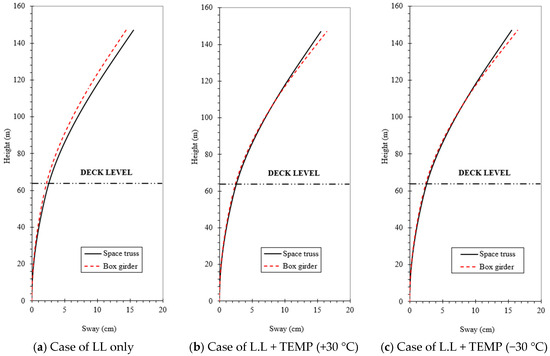 Under the live load (LL) condition only, the tower sway profiles for both bridge systems exhibit similar curvatures, with the maximum sway occurring at the tower top (see Figure 11). The box girder system shows a slightly greater top deflection of about 17.8 cm, compared to 17.0 cm for the space truss system, indicating that the space truss provides slightly higher lateral stiffness at the tower. At deck level (around 63 m height), the sway values are approximately 4.8 cm for the space truss and 5.3 cm for the box girder, again showing about 10% higher lateral displacement for the box girder due to its relatively higher global flexibility and the greater horizontal force component transmitted from the deck (Figure 11a).