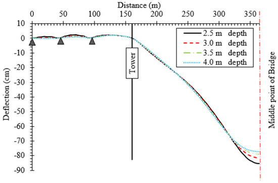 It is also noteworthy that the rate of improvement in stiffness decreases as depth increases. While increasing the depth from 2.5 m to 3.0 m provides a substantial reduction in deflection, further increments beyond 3.5 m offer diminishing returns. This suggests that beyond a certain threshold, additional depth contributes marginally to overall stiffness relative to the associated increase in material and fabrication costs.