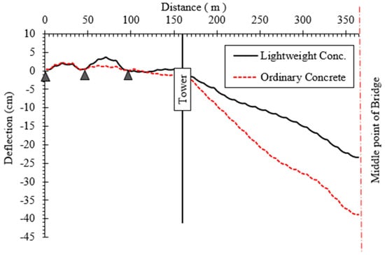 The deflection curves show that the bridge constructed with lightweight concrete exhibits noticeably smaller deflections throughout its span compared to the bridge using ordinary concrete. At mid-span, the maximum downward deflection for the lightweight concrete case is approximately −28 cm, while that for the ordinary concrete system reaches about −40 cm, representing a reduction of nearly 30% in mid-span deflection when lightweight concrete is employed. This considerable improvement indicates that the reduction in dead load—resulting from the lower density of lightweight concrete—significantly decreases the overall bending demand on both the deck and the stay-cable system.