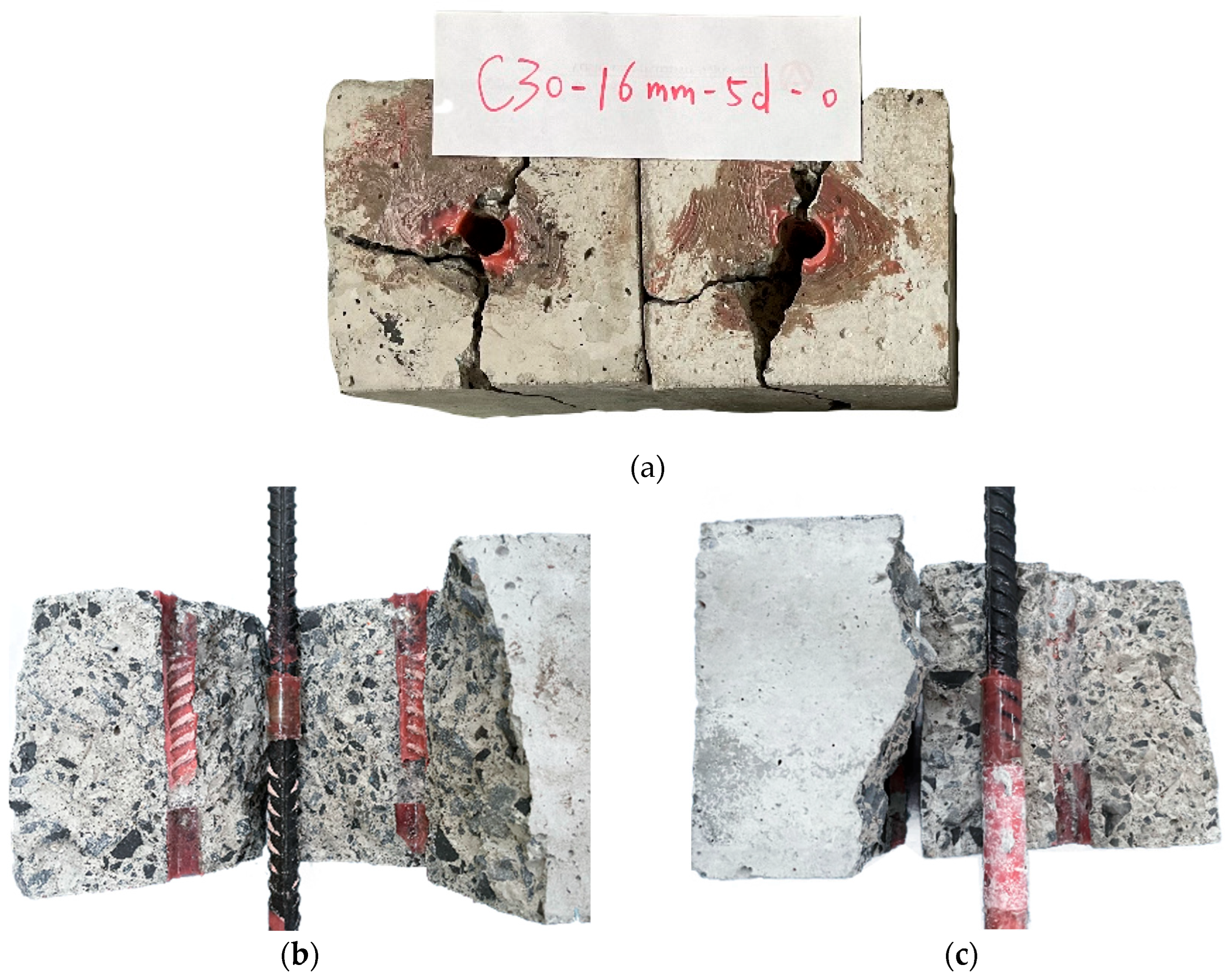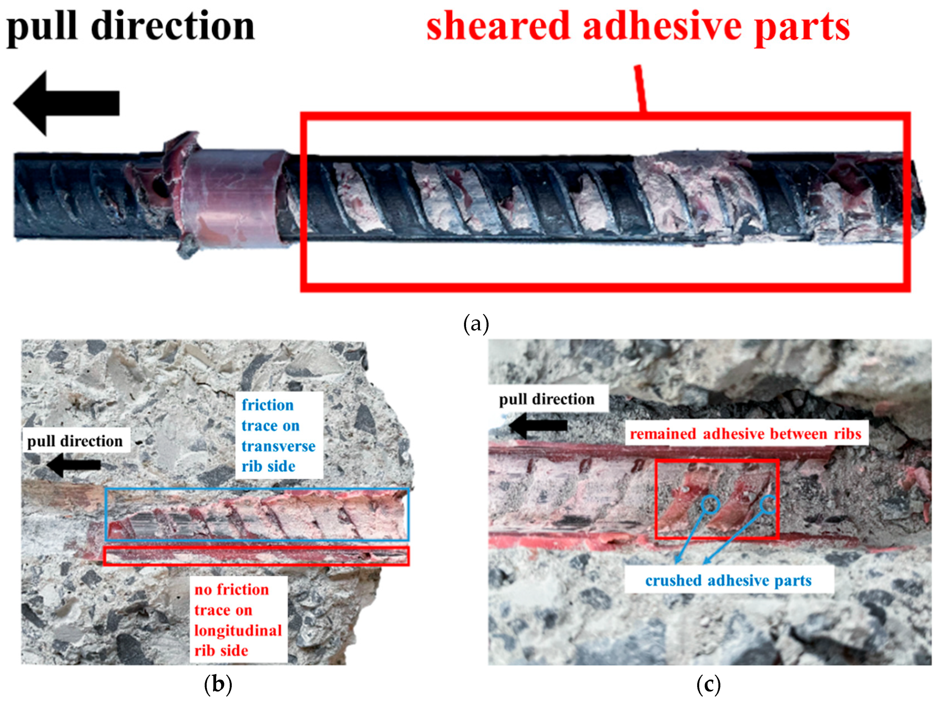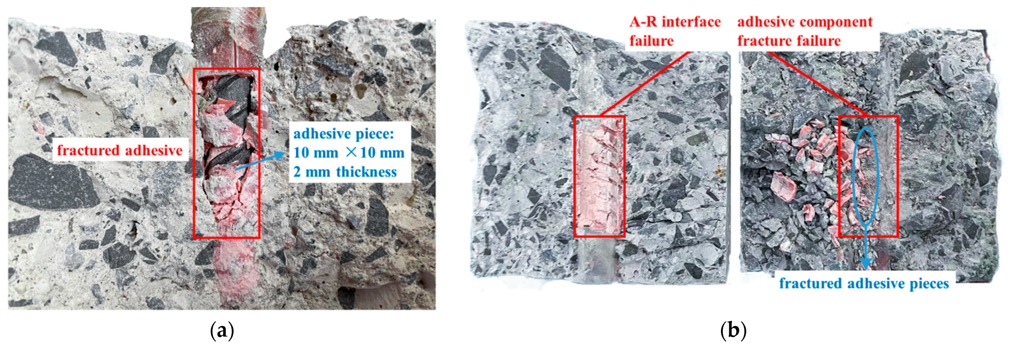 - Zhao, N.Y.; Yang, A.L.; Lin, J.Y.; Jiang, H.F.; Yi, B. Experimental investigation of adhesive-related failures in post-installed rebars under transverse pressure. J. Build. Eng. 2025, 114, 114419. [Google Scholar] [CrossRef]