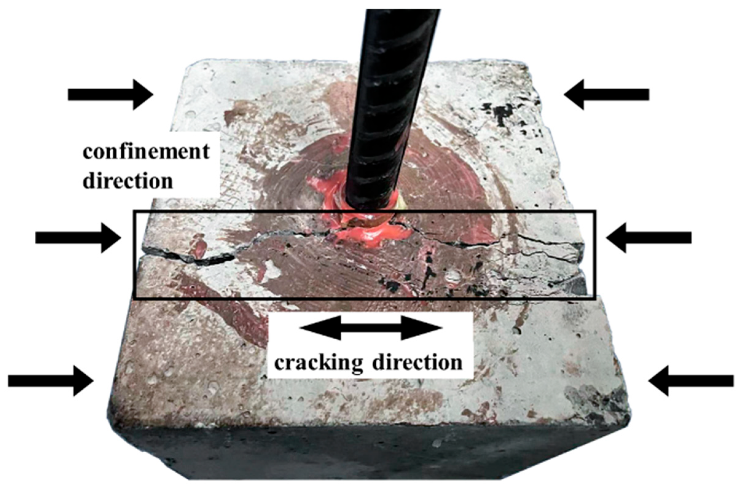 - Zhao, W.P. Impacts of transverse pressure on bond capability of bars in concrete. Eng. Mech. 2012, 29, 168–177+184. (In Chinese) [Google Scholar] [CrossRef]