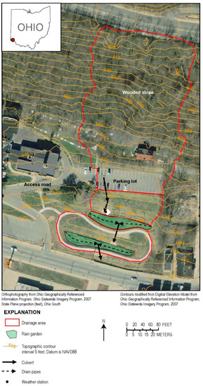 - Dumouchelle, D.H.; Darner, R.A. Visualization of Soil-Moisture Change in Response to Precipitation within Two Rain Gardens in Ohio; Geological Survey Data Series 837; US Geological Survey: Columbus, OH, USA, 2014.
