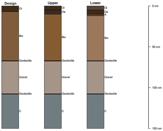 Soil profiles developed over time, and the stratification of the surface mulch layer was similar for both gardens. Serial, bi-annual mulching (2012, 2014) led to the development of a pronounced organic horizon in both gardens, which we attributed to the hardwood-chip mulch composting in place (Figure 2). Over the ensuing six years since construction, the surface horizons in both gardens stratified into the coarse, newer mulch layer that comprises the Oi horizon, which transitioned to the finer, older layer of organic matter that define an Oa horizon (Figure 2). By 2016, the total organic layer thickness ranged from 4 to 13 cm, and 7 to 25 cm in the upper, and lower gardens, respectively. Due to inlet stormflow, mulch was redistributed in each garden, and especially in the upper garden so that combined depth of the Oi, Oa horizons varied widely; ranging from about 8 cm (closer to the inlets) to 25 cm (farther from the inlets), indicating that mulch was pushed outwards from points nearest the flow outlet that communicated flow into the rain garden. Further profile development occurred in the mineral horizons, but only for the lower rain garden. By 2014, a thin A horizon had developed in the lower rain garden (Figure 2), which may have contributed to keeping infiltration rates consistent in the lower garden mineral soil layer. The development of new soil layers—and the accompanying flow discontinuities—may have further regulated the infiltration process in the lower rain garden, which may explain observed ponding nearest the inlets, where soil formation is most active and layering is most pronounced. The coarser sands (larger particle size) in the upper rain garden had high infiltration and throughflow rates due to its overall weak structure, and a high degree of structural macroporosity. Although limited to observations on bulk density soil cores, soil macroinvertebrate presence was observed in the upper, but not the lower rain garden. Macroinvertebrate activity (e.g., ant and earthworm burrowing) creates macropores that—when soils are saturated—can rapidly channel flow to the gravel storage sub-layer. Therefore, a combination of both soil development and biogenic processes may have furthermore maintained high infiltration rates in the upper garden, and regulated the same in the lower rain garden [22,23,24,25,26].
