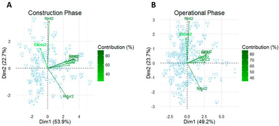 Principal components explain 77 (A) and 73 (B) percent of total variance in the dataset, with scaled data evenly distributed around the space formed by the components. Note that the roles of F1 and F2 are complimentary, with total rainfall playing a major role in driving flows into, through, and out of the network. Average event rainfall intensity (Rint2), duration (Rdur2) loading along F2 appear to be largely independent of F1 hydrologic processes, with evapotranspiration losses (Etloss2) playing a more predominant role in the operational than construction phase along F2.