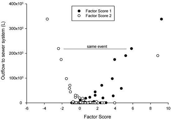 We next analyzed how these different factors synthesize to create conditions for overflow to the CSS. In Figure 4, factor scores for events are plotted pairwise (Factor 1, Factor 2) against event outflow volume. For events when system capacity is never exceeded and stormwater volume inputs are stored, factor scores for both Factor 1 and Factor 2 are small. This is related to overall low values of total event rainfall depth, low inflow volume, and an absence of flow moving through the network (Figure 4). As Factor 1 scores (as rain event depth) increase, flow through the network is initiated, which activates threshold or larger categories of outflow volume to the CSS (Figure 4), and evapotranspiration losses are proportionally less important in the regulation of these outflows. For the largest rainfall events (some of which may also have high intensity), outflow volumes are considerable, ranging from 10,400 to 338,300 L (Figure 4), and differences between Factors 1 and 2 are maximized. The only significant loss from the network under the largest stormflows is outflow to the CSS. Factor 2 scores are highly variable, which we attribute to event-wise differences in evapotranspiration losses, which remove soil moisture from the rooting zone over the course of days, whereas an increase Factor 1 values indicates rapid influx of stormwater volume occurring at the scale of minutes or hours.