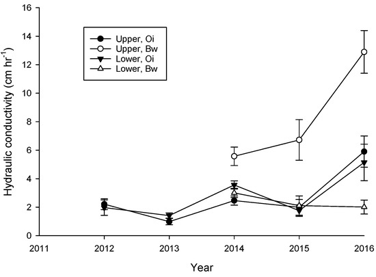Infiltration for organic, mineral soil layers in each of upper and lower rain gardens at St. Francis Apartments (Cincinnati OH), 2012–2016. For reference, the infiltration rate of surrounding turf areas is 0.6 ± 0.1 cm h−1.