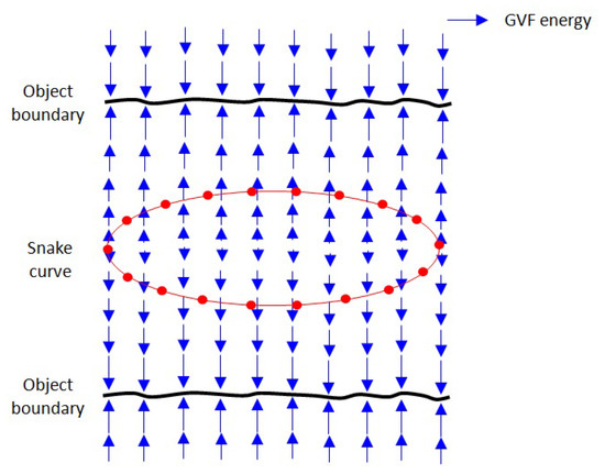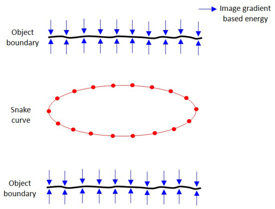 For the snake curve to converge on the object boundary, the snake’s energy function, in Equation (3), should be minimised. To minimise the energy function, the snake curve must satisfy the Euler condition as [20]: