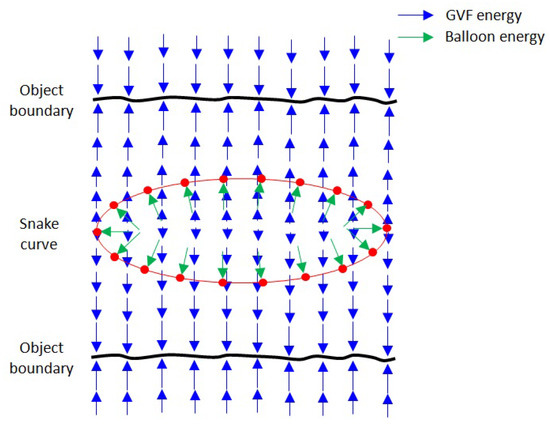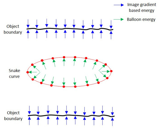 The balloon energy pushes the snake curve towards object boundaries, while the image gradient-based energy attracts the snake curve toward the object boundaries, as shown in Figure 4.