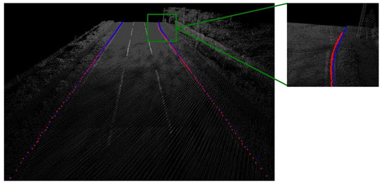We tested our road edge extraction approach on a 50-m section of road, which consisted of a grass-soil edge along its left side and a kerb edge along its right side. This road section was selected to validate the robustness of our approach in extracting distinct sets of edges. The processed dataset for the road section were acquired using the StreetMapper MLS system in County Nottinghamshire, U.K. [46]. To process the road section, we used six sets of a 30 m × 10 m × 5 m section of LiDAR data and six sets of a 10-m section of navigation data. The road edge extraction approach was applied to the road section with parameters selected as , , , , , and . The left and right edges in the selected road section were also manually digitised in order to make a comparison with the edges extracted through our approach. The extracted 3D edges are represented in red, while the manually-digitised 3D edges are represented in blue in the road section, as shown in Figure 10.