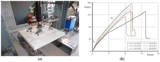 2, and the force was applied using a hydraulic servo-actuator with displacement control at a rate of 0.02 mm/s. During the tests, the load and the support reactions were measured using load cells, and the deformation at critical points was measured with linear variable differential transformers (LVDTs) with a frequency of one record per second. The tests stopped when shear-punching failure occurred, identified by a significant drop in the strength capacity.