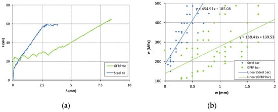 Figure 6a). For the same level of stress, the cracks’ width is inversely proportional to the Young’s modulus of the rebars’ material. In ties with GFRP rebars, cracks’ width is, on average, 3.3 times higher than that of ties with steel rebars (