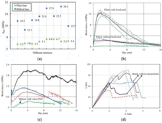 Based in these studies, the following conclusions were drawn: (i) Adding nanoparticles to the concrete mixture influences mostly the adhesion component, which is particularly relevant when plain rebars are used. (ii) Regarding the cracks’ width, the effect of the rebars’ ribs is predominant compared to the addition of nanoparticles, thus leading to a higher increase in bonding (
