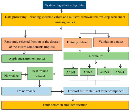 To model the current system’s status and make the prediction of the future state, historic big data of the components’ degradation are needed, because the future degradation behavior of the system will be like the historic pattern. The procedure used for this prediction is shown in Figure 2.