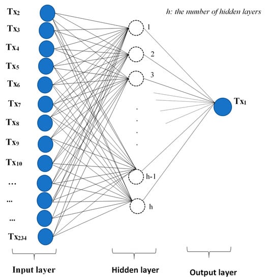 ANN architecture used for the model development, Tx1 is the target component (output) and Tx2, Tx3, …, Tx234 represent the source components (inputs) of the system.