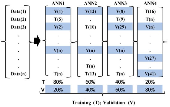 Since this study aims to make a prediction of the future status of the target component from a given set of historic data, a four-fold cross-validation ensemble (Figure 4) that used randomization to pick the validation data from the original dataset was adopted. It can be recalled that this technique has the advantage of considering all sections of the dataset in the training and validation, thereby giving room for robust prediction when compared to the classic approach that uses a given fraction of the data for training and validation. Again, this technique is necessary for reducing variabilities in prediction results and minimizing the chances of type III error, which results in the wrong hypothesis, due to erroneous conclusions [38]. By randomly choosing 20%, 40%, 60% and 80% of the original dataset at separate occasions as the validation dataset and using the remainder as the training dataset, the ANN models were trained. The networks were built with a Multi-Layer Perceptron (MLP) algorithm in a backward propagation technique, by applying grid search to determine the best-trained network amongst different networks having various hidden neurons and learning rates. The varying hidden neurons (Hn) were computed with the expression in Equation (4), by considering the number of input variables (ncol) in the datasets, because preliminary analysis showed that the trained networks with the values obtained from the equation produced high precision results. The learning rates used for the training of the networks were 0.01, 0.15 and 0.25.