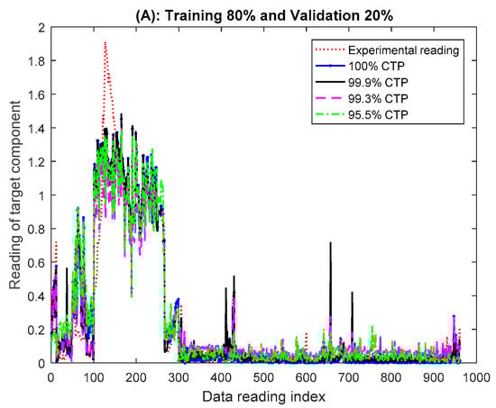 The correlation of the cross-validation ensemble ANN predicted target component readings and the experimental results shown in Figure 6 as determined with Equations (5)–(7) are summarized in Table 3.