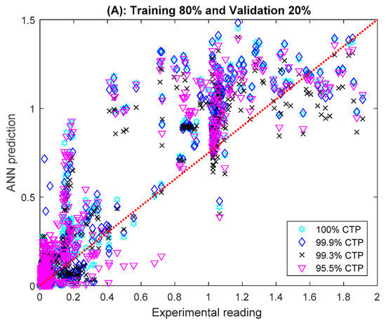 The aggregates of the ANN results obtained at each of the CTP levels—95.5%, 99.3%, 99.9% and 100%—were found by calculating the averages of the built ANN models—ANN1, ANN2, ANN3 and ANN4 (Figure 4)—at the levels. After trying between 1000 and 5000 iterations of the ANN training networks, the best networks from each CTP level was used to compute the Hit Ratio (HR), Miss Ratio (MR), Mean Square Error (MSE) and the coefficient of determination (R2) of the trained and validation datasets per Equations (5)–(7) [39].