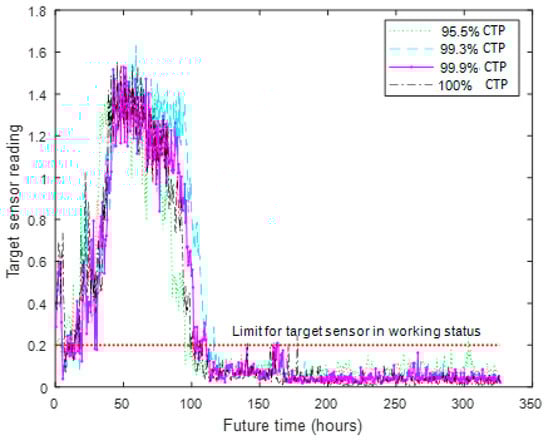 The best results of the trained networks were used for the estimation of the future state of the target component by randomly generating readings from the original dataset (source components). These readings were subjected to measurement noises that were assumed to cause the readings to fluctuate randomly between ±2.5%. The summarized results of the average future target sensor readings at the CTP levels are shown in Figure 7. Since the 99.9% CTP level gave the best estimation of the validation dataset of the target component, the expected future status of the target component was computed with the model. The summary of the target sensor behavior in the future 358 h (~15 days) using the 99.9% CTP level is shown in Table 6. The future readings of the target component (Table 6) form the basis for decision-making on the time faults are to be expected and the requisite actions to be taken. Hence, when the target component is expected to have a faulty status that will last for less than four hours, the maintenance will be expected to be a minor one and could involve replacement of fuses and resetting of relays. However, when the future time of failure is expected to last for 4–16 h consecutively, a major maintenance will be planned. This category of maintenance may warrant fault isolation at the sub-system levels and requires higher specialty of technical personnel in comparison to minor maintenance operations. Similarly, when the expected future faulty status of the target component goes above 16 h consecutively, a shutdown maintenance is anticipated, because some critical components, such as the bearings, shafts, rollers etc., will either need replacement or servicing, due to deteriorations that could involve deformation, fatigue failure, cracking and corrosion damages.