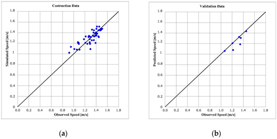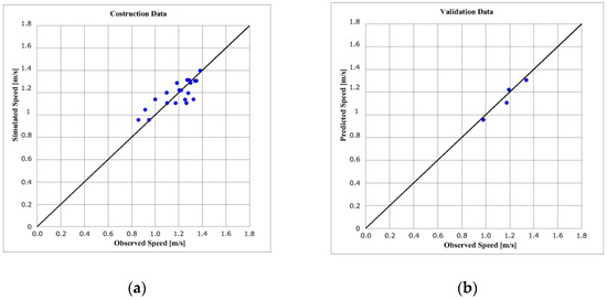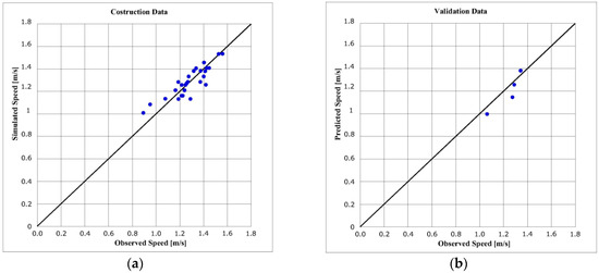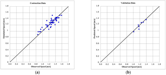 Additionally, in the model validation phase, all the considerations mentioned in the model construction phase are valid: observed and predicted speeds have good agreement if, graphically, data lie roughly on a 45 degree line.
