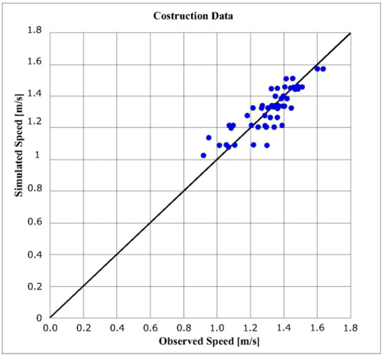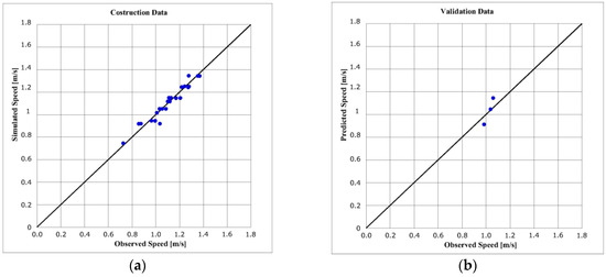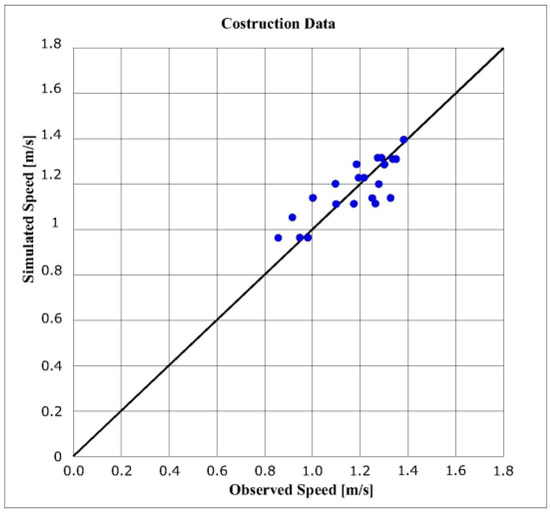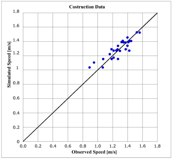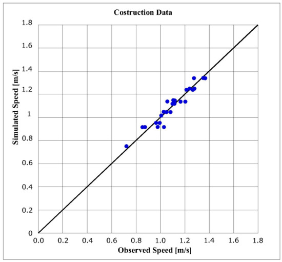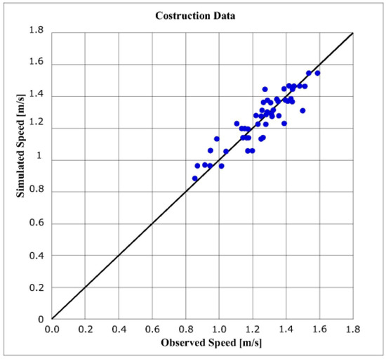 In the model construction phase, it is necessary that observed and simulated speeds have good agreement: this happens if, graphically, data lie roughly on a 45 degree line.