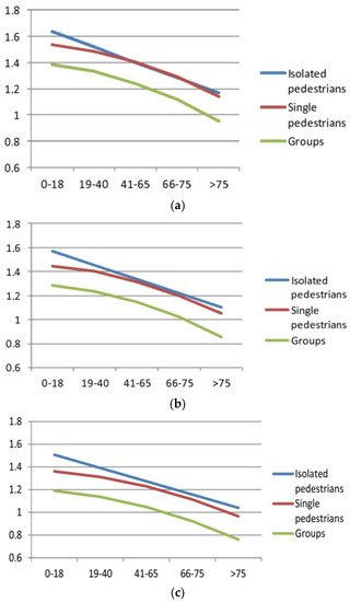 Willis et al. [1] consider many factors, such as age, gender, level of mobility, percentage of groups, time of day, etc., finding that walking speed decreases as age increases; in fact, the youngest pedestrians have the highest speeds and adults are significantly faster than elderly pedestrians, who are the slowest category.