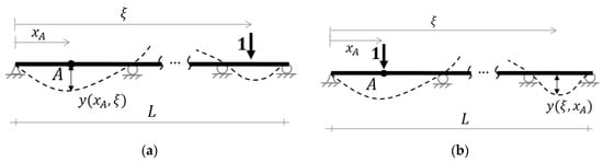 A straight beam with linear elastic material and two-dimensional linear geometric behavior is illustrated in Figure 1a. A unit force is applied on this beam at distance from the left support location. The vertical deflection, (dashed lines in Figure 1a) is a function of the location of the unit load, and varies with the position along the beam. The first argument in the function represents the monitoring location along the beam. The second argument is the location of the unit load. If the first argument varies and the second is fixed, then is a deflection function when the unit load is fixed; if the opposite is true, then is a DIL of the fixed first argument.